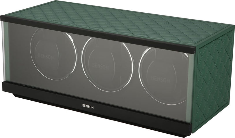 Benson Watch Winder Triple Swiss Series 3.20 Green Leather Limited Edition Benson Swiss Series 3.20 Green Leather. The Dutch watch winder brand Benson presents with the Swiss Series a new high-quality collection of watch winders that is equipped with Swiss technology and is fully assembled in the Netherlands. The Swiss made motors have a very low sound level and are among the best on the market. This compact Benson Swiss Series Triple 3.20 Green Leather watch winder is suitable for winding any automatic watch because the direction of rotation, the number of revolutions per day and the watch holder can be individually set per watch. The specially developed safety system disengages the motor when a watch is placed in or removed from the watch winder. The watch winder works on mains power. You can select the desired settings in the LCD screen with one button. The combination of Swiss technology, high-quality materials, excellent functionality and assembly in the Netherlands make this Benson Swiss Series Triple 3.20 Green Leather watch winder one of the best watch winders in the world.
