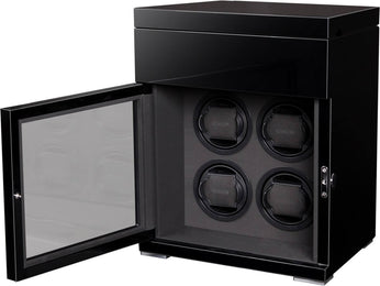 This Benson 4 Black Watch Winder is part of their luxurious Black Series collection and is beautifully handmade to combine a high quality finish with a sophisticated design. Crafted from black gloss coated wood and mineral glass, this watch box has an array of settings to suit any luxury watch. With three different rotating settings, an almost virtually silent Japanese motor and a touch screen display, this Benson Black 4 Watch Winder is a must have for any watch fanatic.