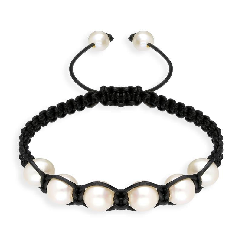 This unique bracelet features 6 lustrous white pearls woven in black leather, secured with an adjustable tie knot and two smaller white pearls to add that extra shine. Perfect for every day wear and a great addition to any jewellery set.