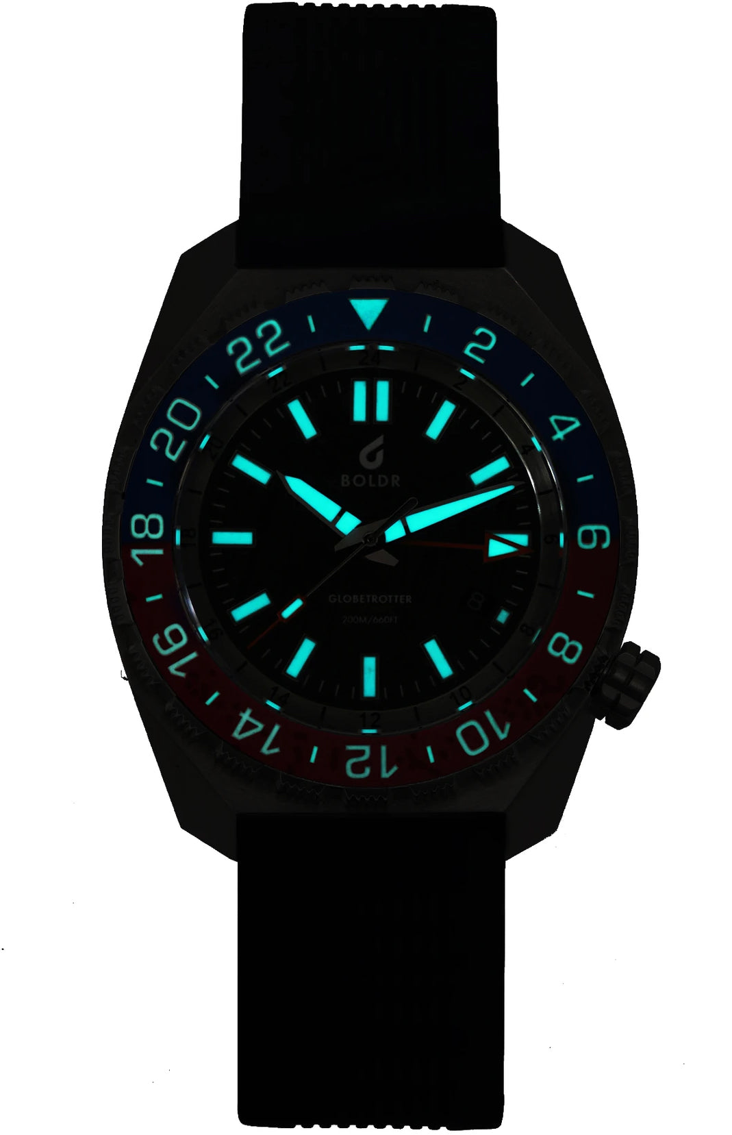 Boldr Watch Globetrotter GMT Blue Black. Every piece is built with features that define the BOLDR brand, a blend of modern and classic design elements incorporated with horological technologies and tough, quality materials. BOLDR watches materials are handpicked for their durability and resilience, because we got tired of capitalistic consumer goods that value quantity over quality.