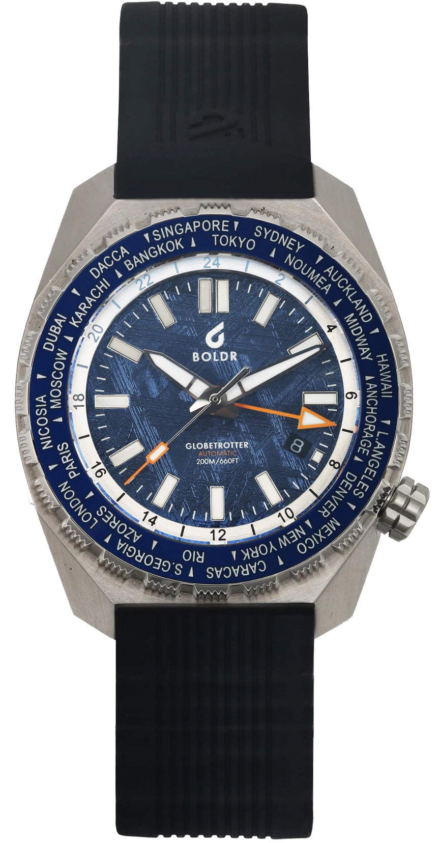 Boldr Watch Globetrotter GMT Meteoblue. Every piece is built with features that define the BOLDR brand, a blend of modern and classic design elements incorporated with horological technologies and tough, quality materials. BOLDR watches materials are handpicked for their durability and resilience, because we got tired of capitalistic consumer goods that value quantity over quality.