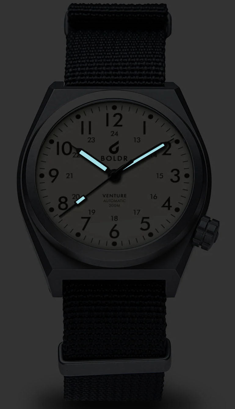 Boldr Watch Venture Ivory White. Every piece is built with features that define the BOLDR brand, a blend of modern and classic design elements incorporated with horological technologies and tough, quality materials. BOLDR watches materials are handpicked for their durability and resilience, because we got tired of capitalistic consumer goods that value quantity over quality.