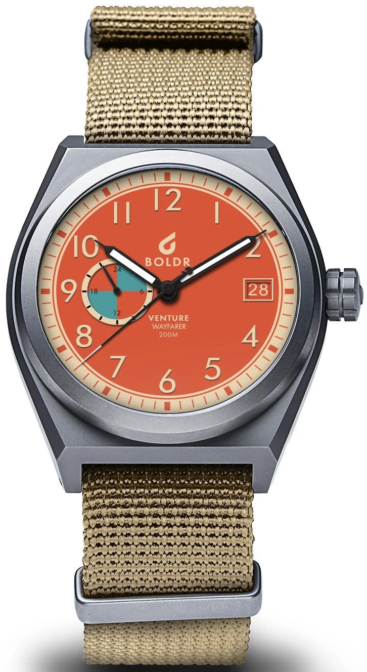 Boldr Watch Venture Wayfarer Tangerine. Every piece is built with features that define the BOLDR brand, a blend of modern and classic design elements incorporated with horological technologies and tough, quality materials. BOLDR watches materials are handpicked for their durability and resilience, because we got tired of capitalistic consumer goods that value quantity over quality.