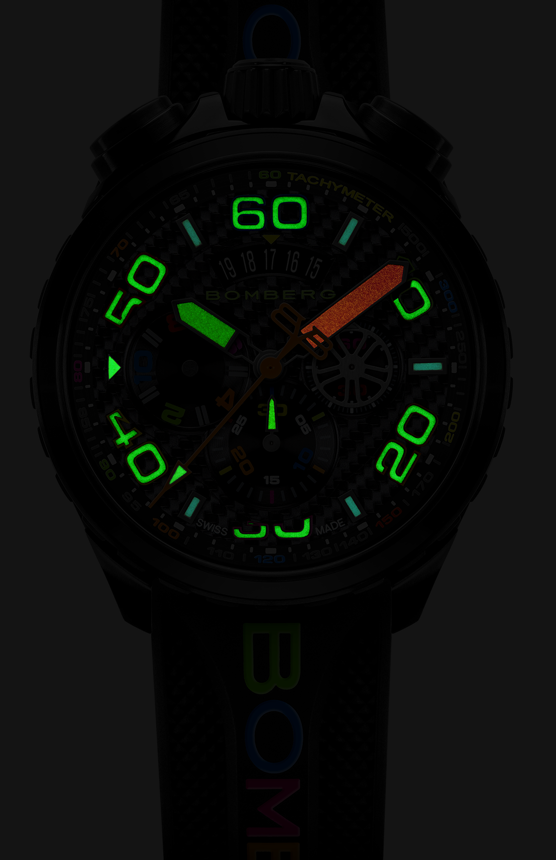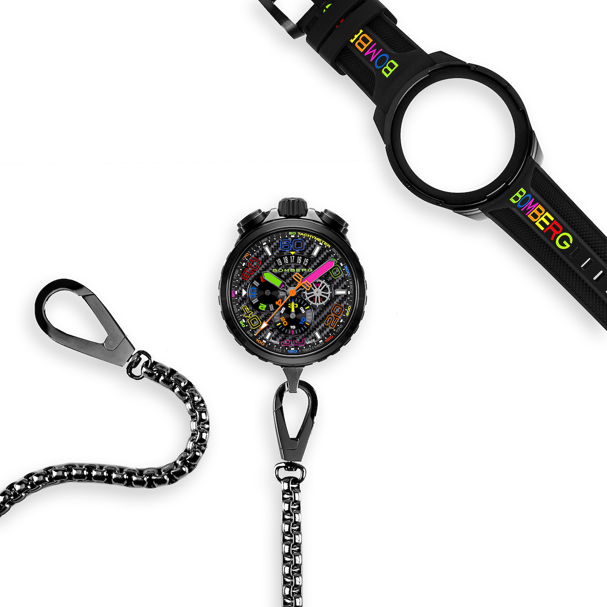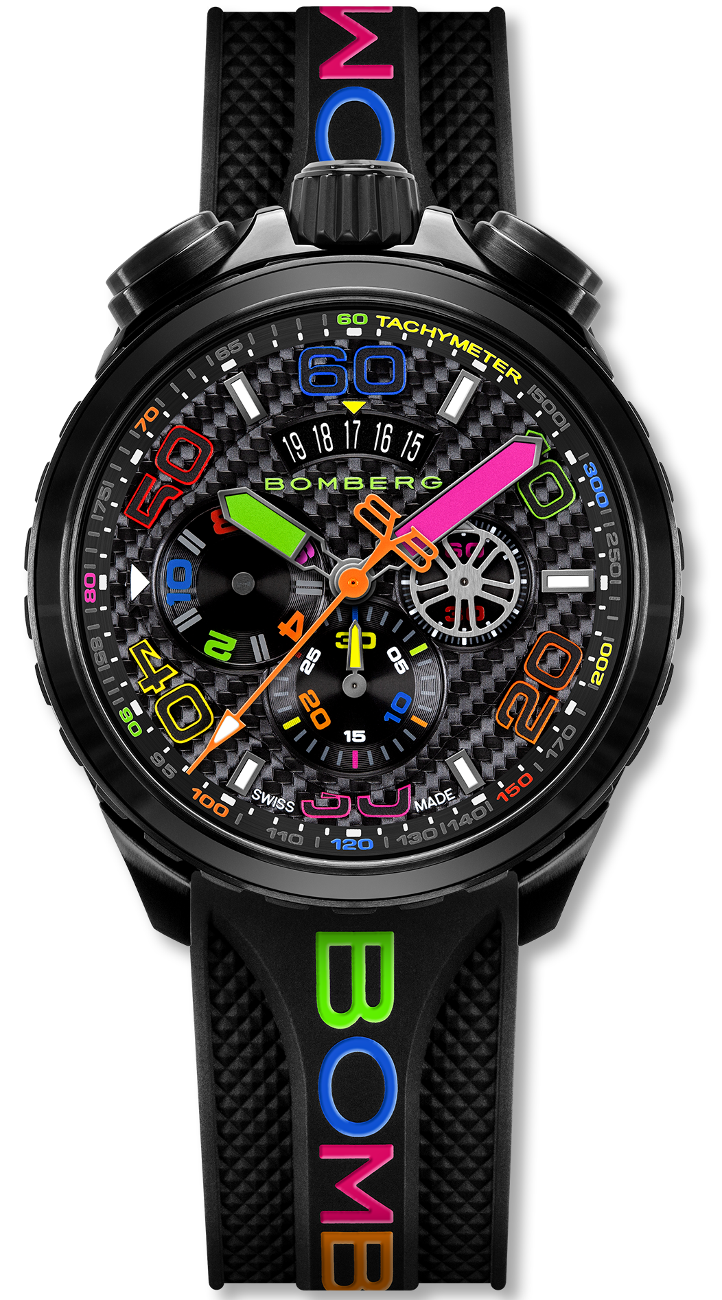 Bomberg Watch Bolt-68 Racing Chroma Carbone Black Limited Edition BS45CHPBA.049-6.2.12. The Chroma Carbon Black and White are more than just timepieces; they are statement pieces designed to add a splash of color and style to your attire and life. Whether you lean towards the urban sophistication of the Chroma Carbon Black or the light, creative spirit of the Chroma Carbon White, these watches are perfect for those who love to stand out.