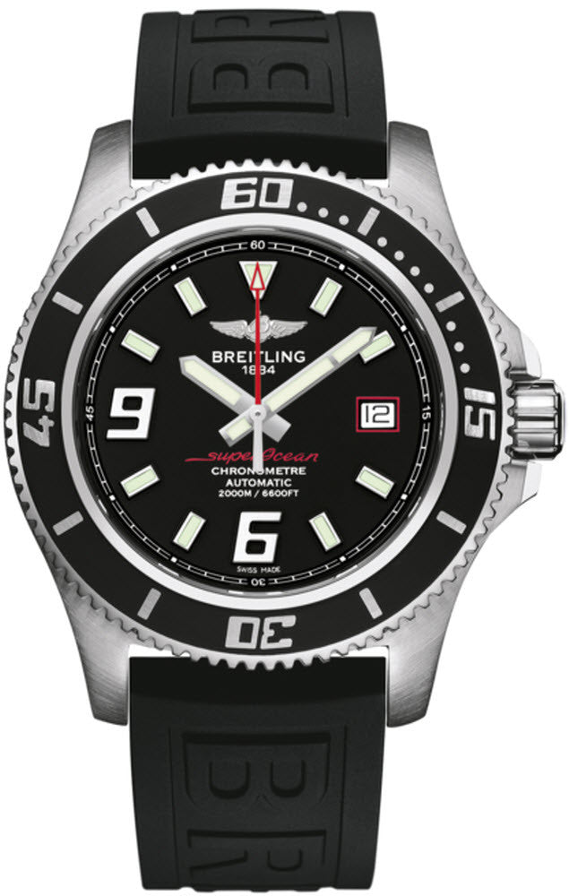 Breitling Watch Superocean 44. Fitted with a slightly larger case, the Superocean 44 is distinguished by its exceptional water resistance to a depth of 2,000 meters (6,600 ft) and its subtly redesigned dial with applied sloping numerals emphasizing the quarters and refined color plays against the black background. A safety valve serves to balance out differences in pressure inside and outside the case.