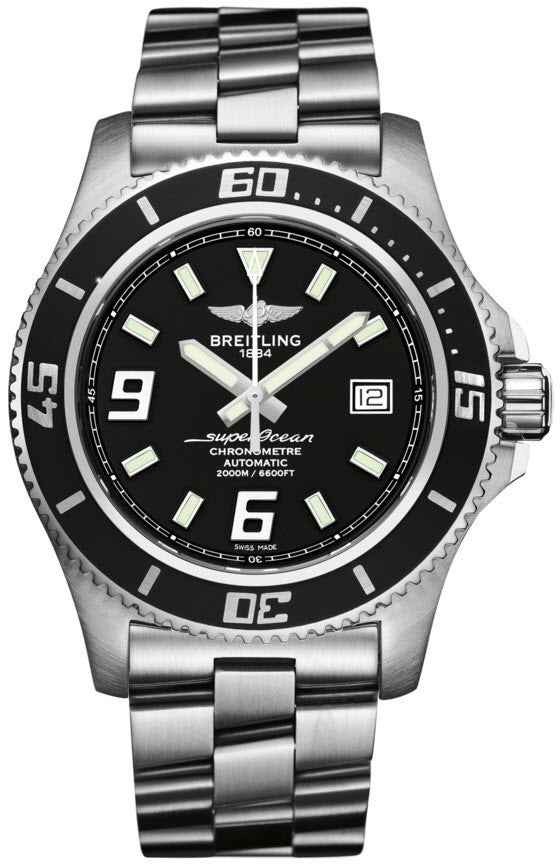 Breitling Watch Superocean 44. Fitted with a slightly larger case, the Superocean 44 is distinguished by its exceptional water resistance to a depth of 2,000 meters (6,600 ft) and its subtly redesigned dial with applied sloping numerals emphasizing the quarters and refined color plays against the black background. A safety valve serves to balance out differences in pressure inside and outside the case.