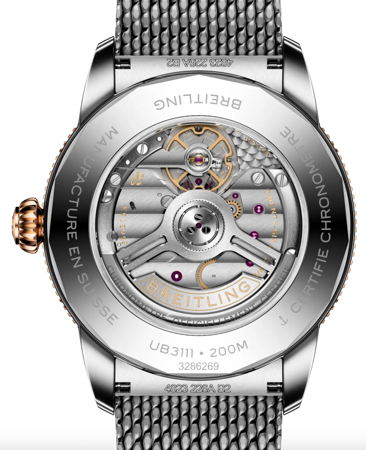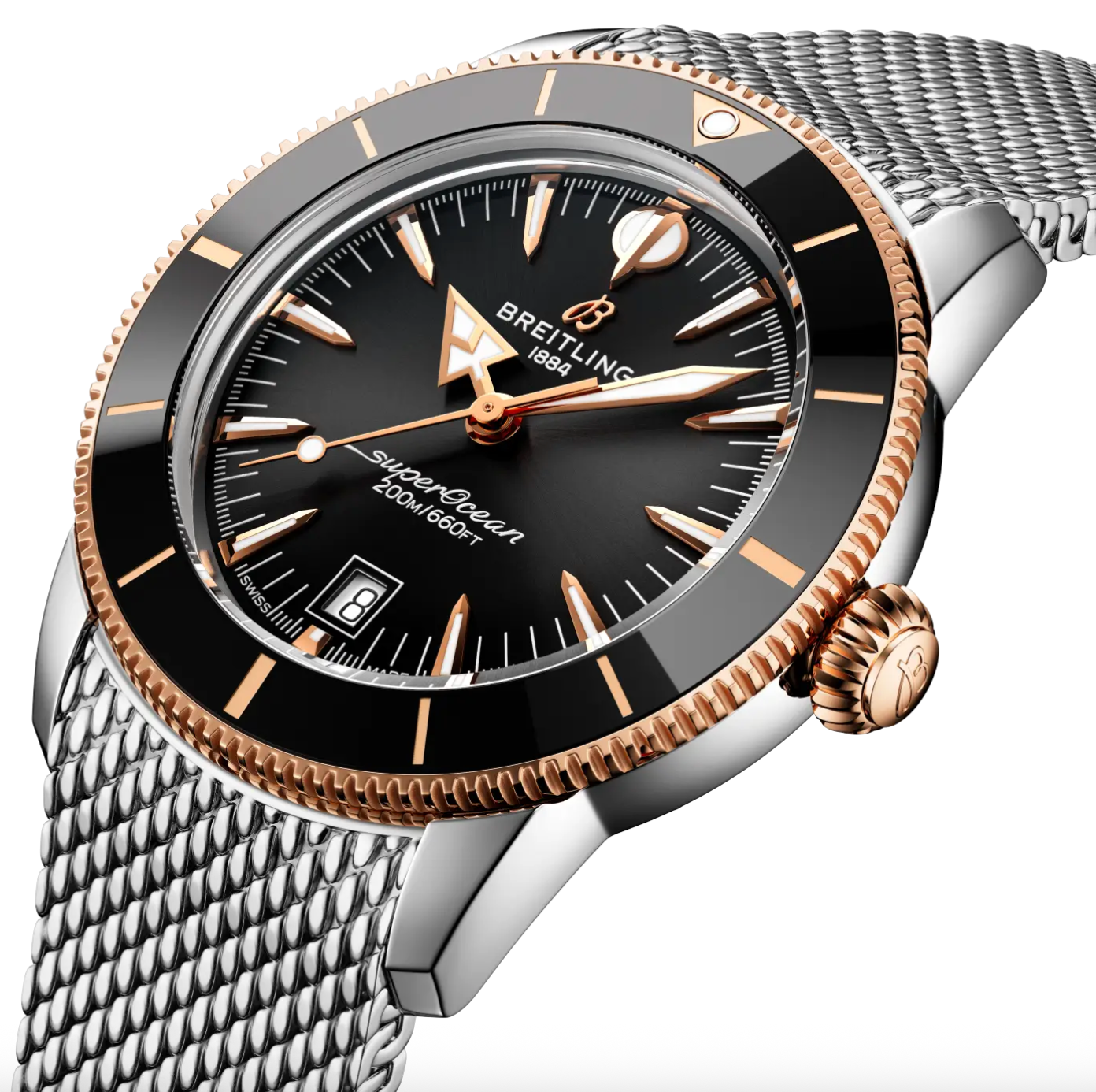Breitling equips a dive watch for the first time with its own in house developed automatic three handed movement, the Calibre 31. Capable of producing a power reserve of 78 hours, the Breitling Superocean Heritage 42 watch reference UB3111241B1A1 is a weekend friendly diver with an impactful presence and uncompromised mechanical efficiency. Flip the watch over and you can view this movement in all its glory, while the two tone elements in 18ct rose gold elevate this model to dressy diver territory, making it a perfect go to for special occasions.