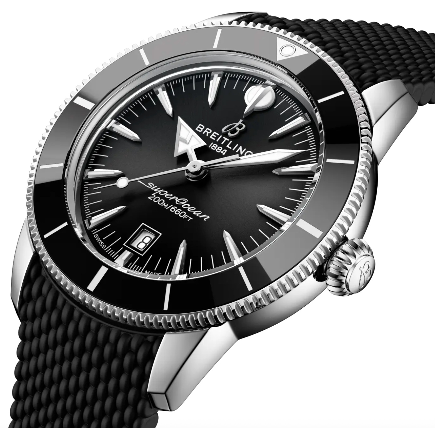 The Breitling Superocean Heritage watch is equally at home under a wetsuit as it is a tailored suit, and that’s all thanks to new modifications that improve its wearability, accuracy, and legibility. The stylish dive watch, with its rounded case shape and beautifully polished surfaces, now features more elegantly curving lugs that extend a little beyond the back of the case to promise a snug fit on the wrist. Breitling also adds improvements to the shape of the hands and hour markers, the mesh bracelet and the clasp, not to mention a specially engraved screw down crown to uphold the watch’s 200M water resistance. This Breitling Superocean Heritage 44 watch reference AB3112241B1S1 features the rubber mesh style strap, giving the dive watch an overall sportier look, enclosing with a refined butterfly clasp.