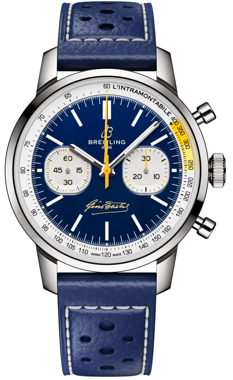 Breitling Top Time B01 Gino Bartali Watch AB01767A1C1X1. The 1960s was a decade of experimentation, fun, freedom and energy. Whether cruising on a motorcycle or revving up a sportscar, living life at full speed was the order of the day. Willy Breitling felt this change of pace and set out to design an unconventional chronograph that would capture the verve of era. He called it the Top Time. That spirited tradition continues today with Breitling partnering with some of the coolest names in wheels to create its Top Time designs.