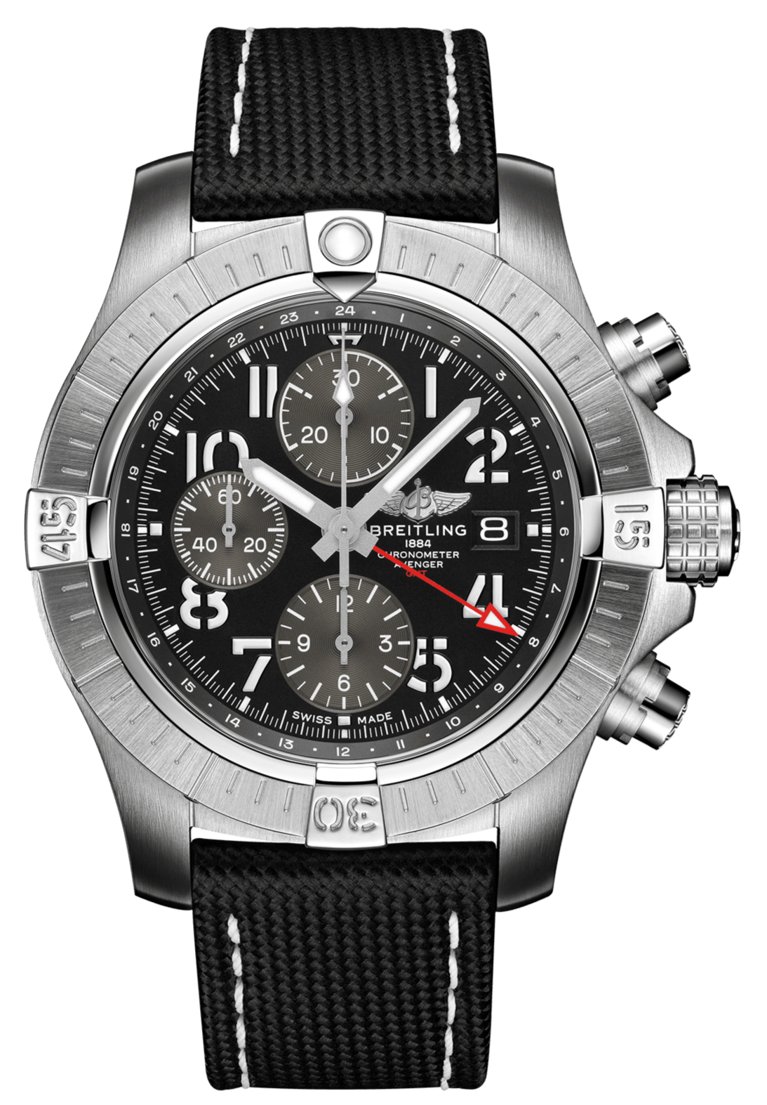 Bold, extremely robust and shock resistant, the Avenger Chronograph GMT 45 combines precision with a powerful design. As a true Breitling Avenger, it offers unrivalled safety and reliability to any airborne adventurer. The Avenger Chronograph GMT 45 features a sturdy 45mm stainless-steel case, black dial and a choice of a stainless-steel bracelet or matching military leather strap. Thanks to its rugged bezel and its special grip-pattern on the crown and chronograph pushers, the Avenger Chronograph GMT 45 can be easily operated wearing gloves.