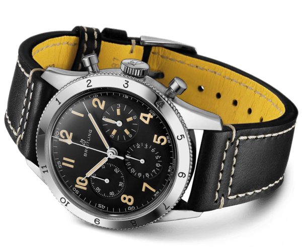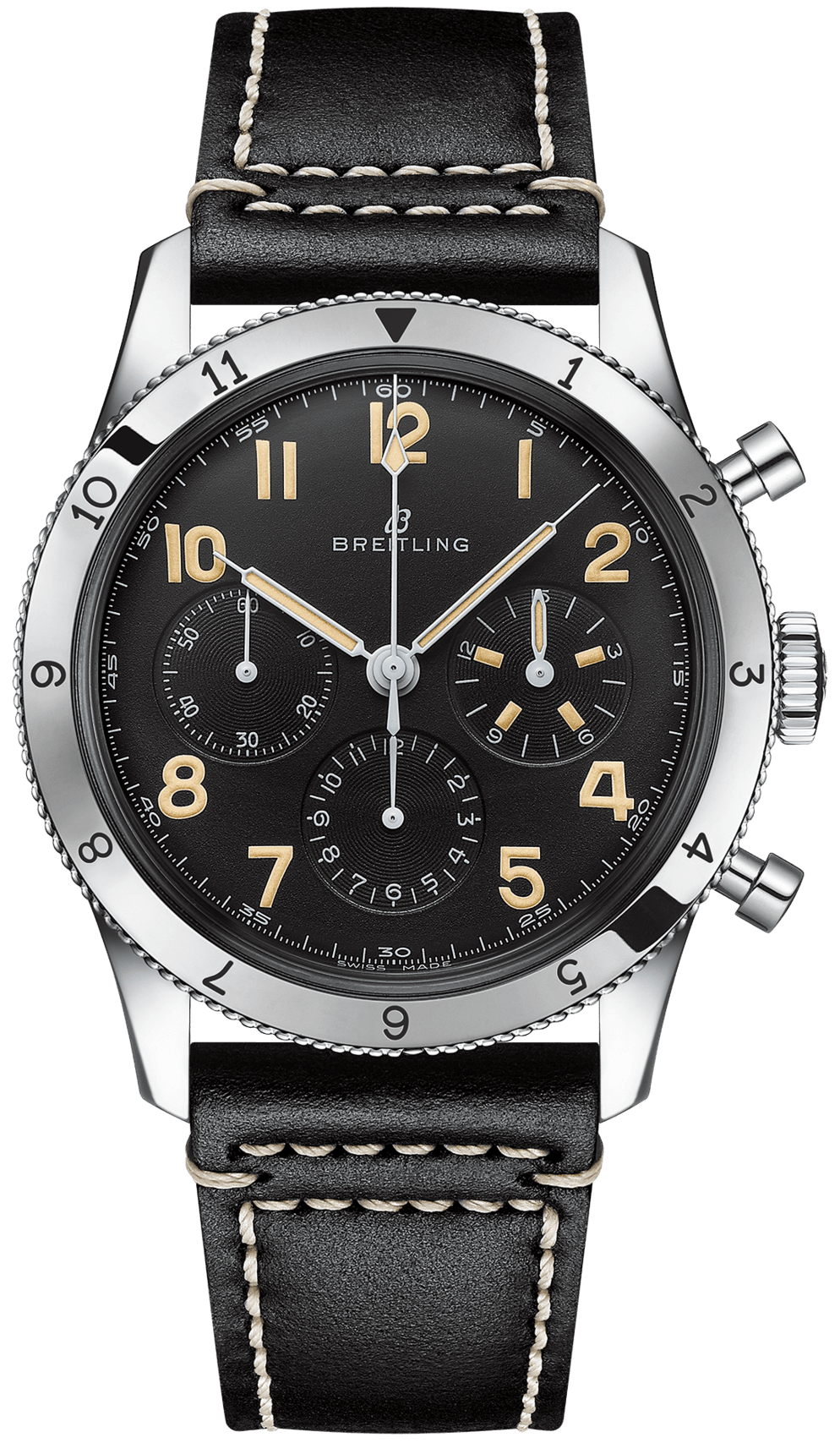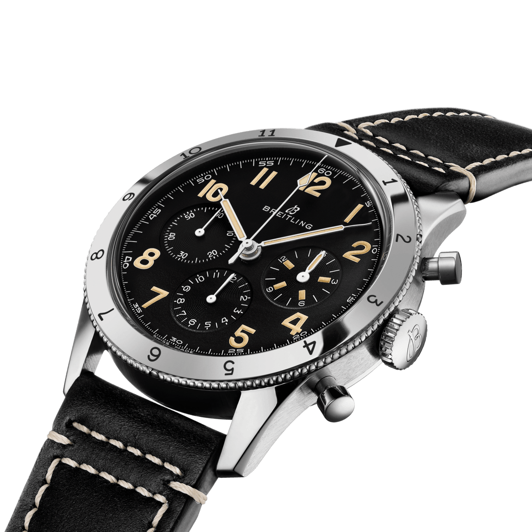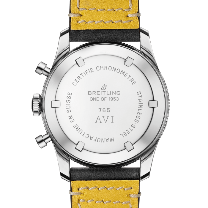 Breitling Watch Aviator 8 AVI REF. 765 1953 Re Edition AB0920131B1X1. Back in the 1950s, the original Co Pilot Ref. 765 AVI starred next to another Breitling icon:. Today, the AVI Ref. 765 1953 Re Edition recreates to the very last detail one of the early executions of the Co Pilot Ref. 765 AVI. Its all black dial, protected by a highly domed Hesalite crystal, has the same Arabic numerals as the original Co Pilot from 1953, with tone on tone small seconds, 15 minute and 12 hour chronograph counters. The hand applied Super LumiNova color has been carefully chosen to recall the original luminescent material and gives the AVI Ref. 765 1953 Re Edition an additional touch of vintage allure. The 41mm stainless steel case is also identical, and the bezel is secured by three screws that are placed in precisely the same positions as those on the watch from 1953. There are only two concessions to modernity that distinguish this new timepiece from its famous ancestor: the water resistance has been improved up to 30 meters and keen eyed observers will see that GENEVE does not appear on the dial anymore. The AVI Ref. 765 1953 Re Edition is powered by the in house Breitling Manufacture Caliber B09, a hand wound COSC certified caliber based on the renowned Breitling Caliber 01 and developed specifically for historical re editions. It is available on a black vintage inspired leather strap with a pin buckle as a limited edition of 1953 pieces, each of which is engraved ONE OF 1953.