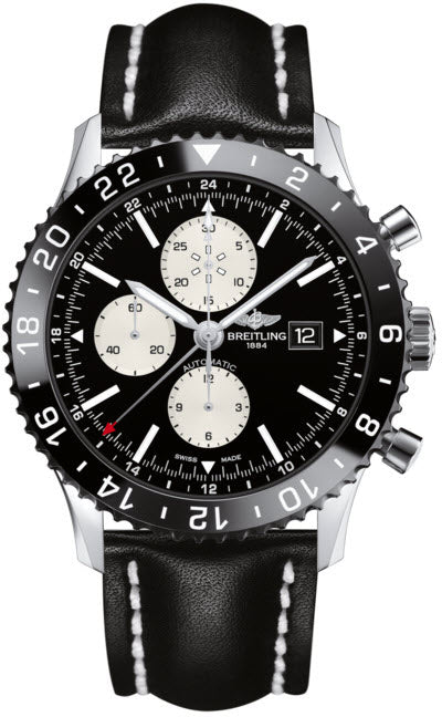 Breitling Watch Chronoliner Black Leather Y2431012/BE10/441X. Inspired by a Breitling model from the 1950s 1960s, the Chronoliner asserts itself as an authentic captains watch. Its signature feature is a broad bezel in scratch resistant high tech ceramic (an ultra hard synthetic material), featuring an original star shaped cut out. The red tipped hand enables second timezone readings in 24 hour mode, while the rotating bezel indicates a third timezone. Just the ticket for a long haul flight anywhere in the world. The performance of the selfwinding chronograph is displayed with impressive legibility on a dial worthy of the finest flight instruments.