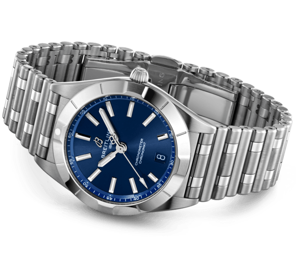 Powered by one of the brand’s famous SuperQuartz movements, the Breitling Chronomat 32 Ladies watch promises a precision ten times more accurate than a standard quartz watch and a battery life of 3 to 4 years. The Breitling 77 calibre also delivers classic central hands for hours, minutes and seconds and an elegant date window at 6 o’ clock, all beautifully presented on a stunning blue dial decorated with Superluminova hands and indexes. Measuring to a feminine 32mm in size, the Chronomat 32 Ladies is executed in polished stainless steel and completed by a matching stainless steel Rouleaux bracelet and scratch resistant cambered sapphire crystal glass treated with anti-reflective coating. Designed especially for trailblazers requiring only the best in performance, precision and beauty, the Chronomat 32 is the perfect Breitling watch for women.