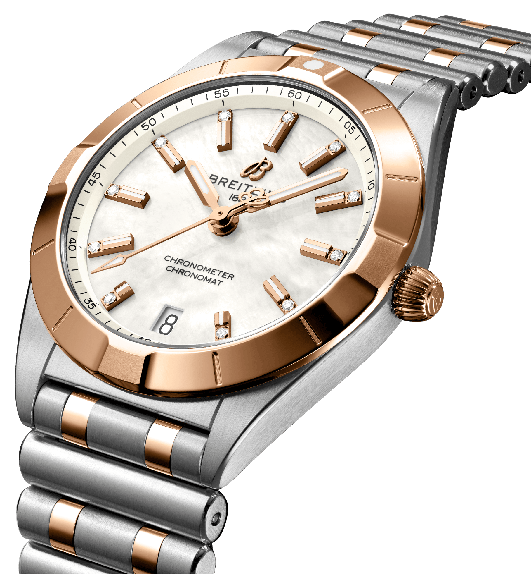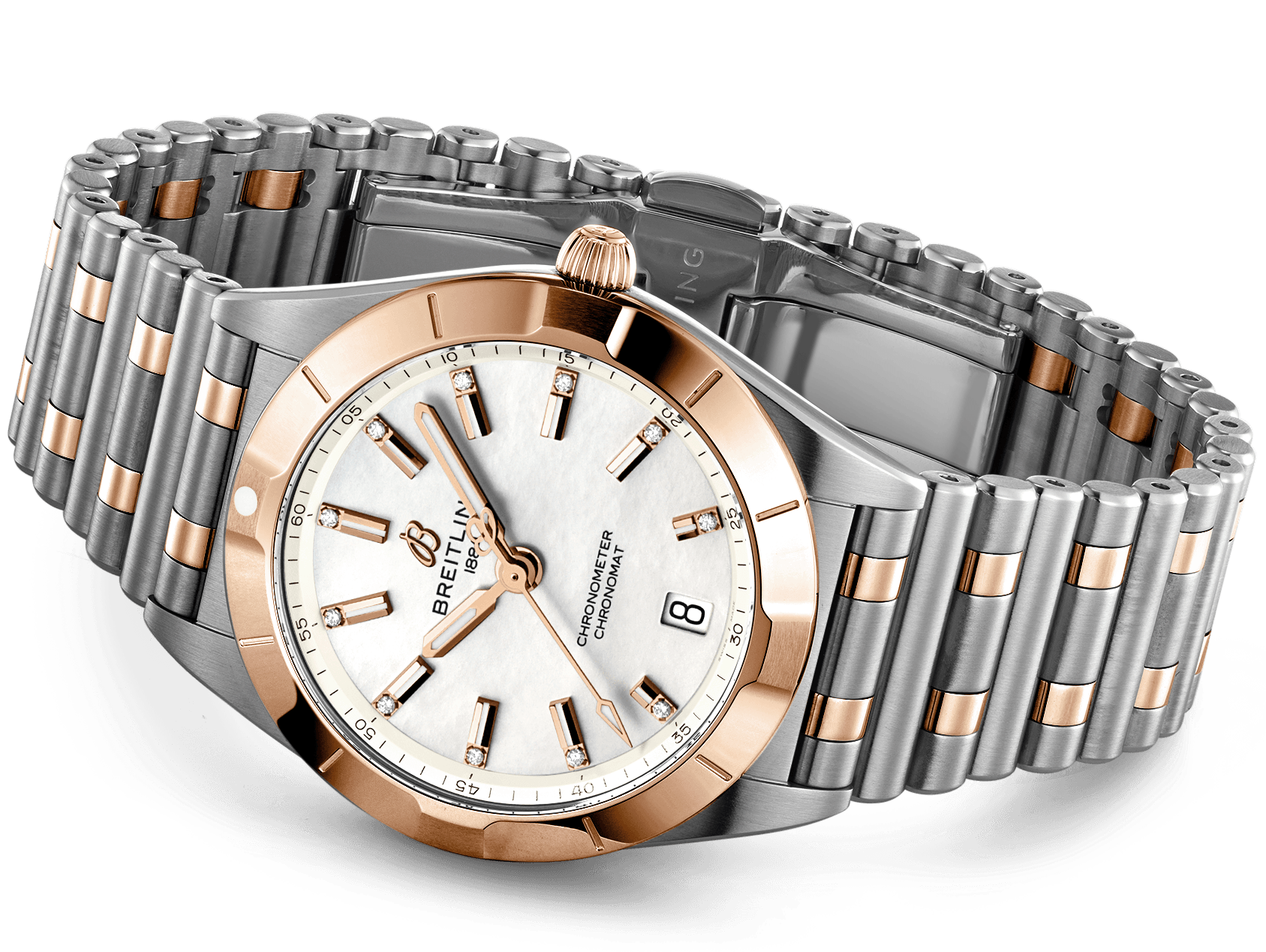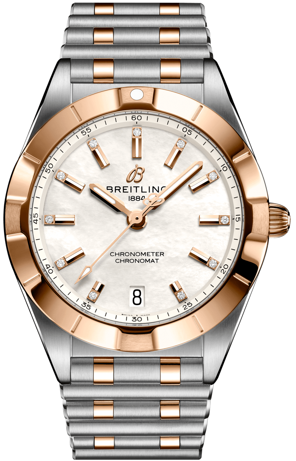 Breitling Watch Chronomat 32 U77310101A2U1. Stylish yet elegant, the modern-retro inspired Chronomat 32 is the versatile sporty and chic watch for any occasion. It is available in an array of metal cases, from cool stainless steel, to goes-with-everything bicolor, or even luxurious 18k red gold. Women craving extra sparkle will also be able to opt for diamond-set bezels, indices, and colourful dials. Featuring Breitling’s iconic and comfortable “Rouleaux bracelet with a butterfly clasp, the Chronomat 32 is powered by the Breitling Caliber 77, a COSC-certified SuperQuartz™ chronometer.