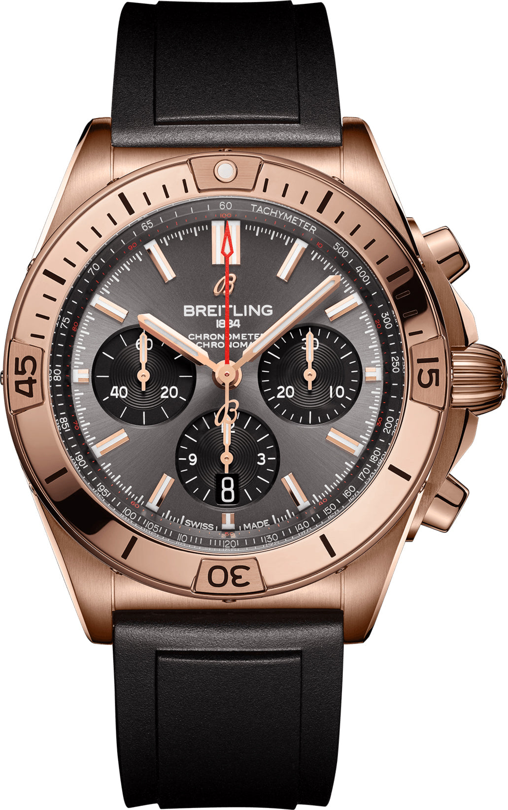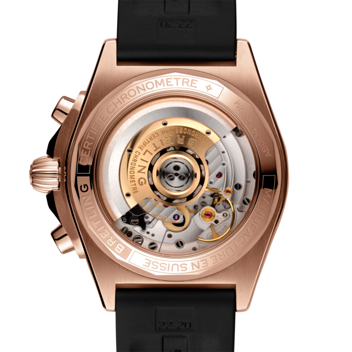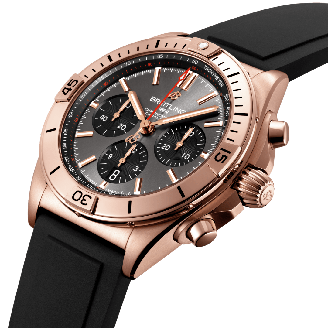 Like the original 1983 Chronomat watch, the Breitling Chronomat B01 42 features a sophisticated case crafted from 18 carat rose gold and fitted with integrated lugs, robust shoulders, and a classic rounded crown. The ratcheted 18 carat rose gold bezel and knurled crown have been purposely designed for use by sportsmen so that they can be easily manipulated even with gloves on. Housed within the case and exposed beautifully through the exhibition case back, the legendary Breitling B01 automatic winding calibre works its magic, powering the central hands for hours, minutes and chronograph seconds, date, continuous seconds dial, chronograph counter for 30 minutes and 12 hours and the power reserve of 70 hours. The functions are neatly presented on an anthracite coloured dial decorated with rose gold Superluminova hands and indexes, contrasting black chronograph counters and the iconic Breitling logo at 12 o clock, all protected by scratch resistant sapphire crystal glass coated with anti-reflective treatment.
