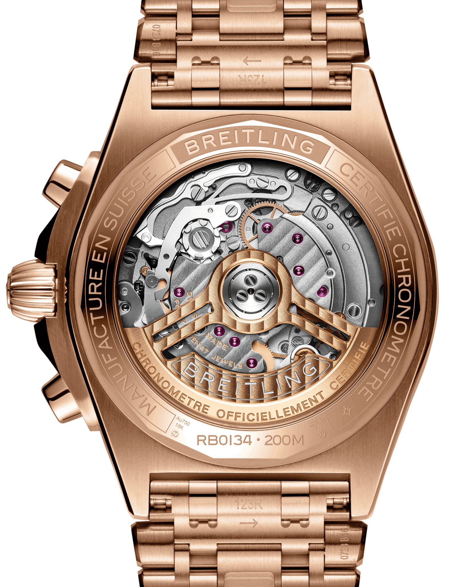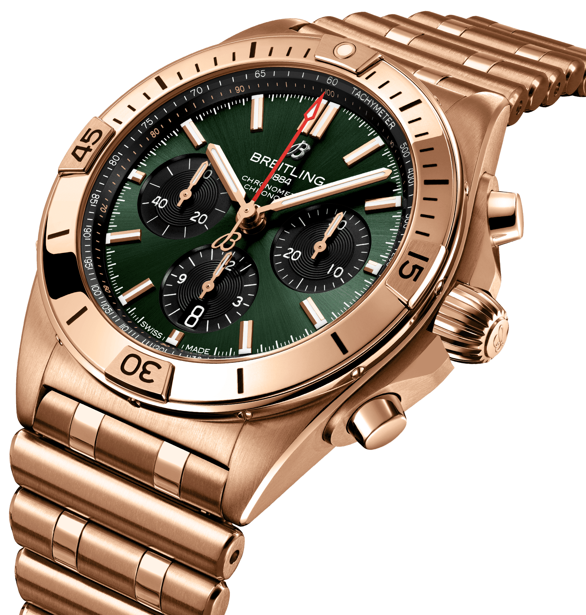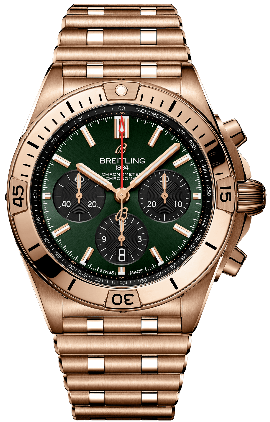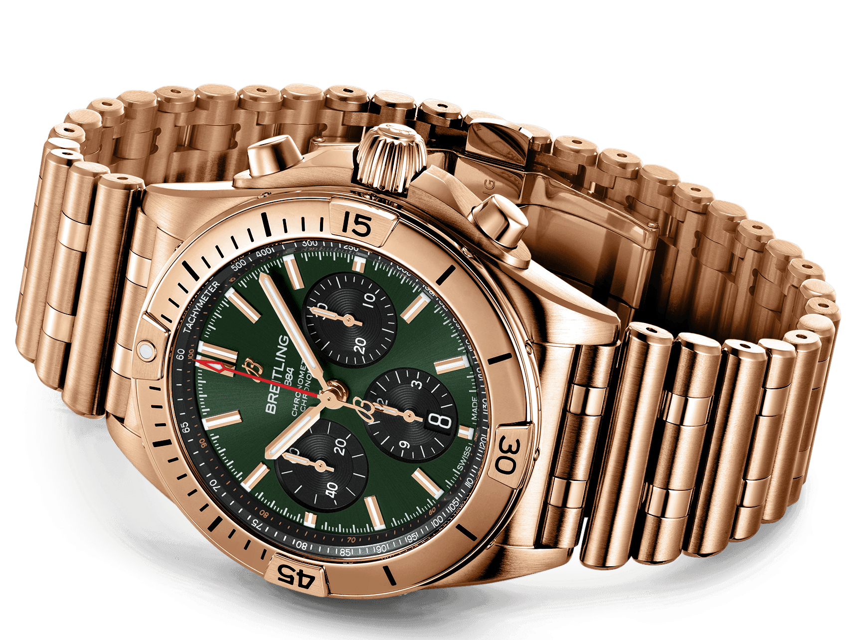Breitling Watch Chronomat B01 42 RB0134101L1R1. Breitling’s all-purpose watch for your every pursuit. The Chronomat holds a significant place in Breitling’s history. Introduced in 1984, at a time where extra-thin quartz timepieces were the order of the day, Breitling placed a bold bet on an impressively proportioned mechanical watch. Based on the Frecce Tricolori chronograph, which had been developed and launched in 1983 in collaboration with the famed Italian aerial squadron, the Chronomat celebrated Breitling’s centenary in style and marked the return of the mechanical chronograph to its rightfully prominent place at the brand which had built its global reputation on these incredible watches. Available in a variety of materials from stainless steel to luxurious 18 k red gold, the Chronomat features a 42 mm case and the iconic bezel with the four rider tabs. Available in a range of colorful dials, the Chronomat is matched to the signature “Rouleaux bracelet in metal or rubber and is powered by the in-house Breitling Manufacture Caliber 01, a COSC-certified chronometer.