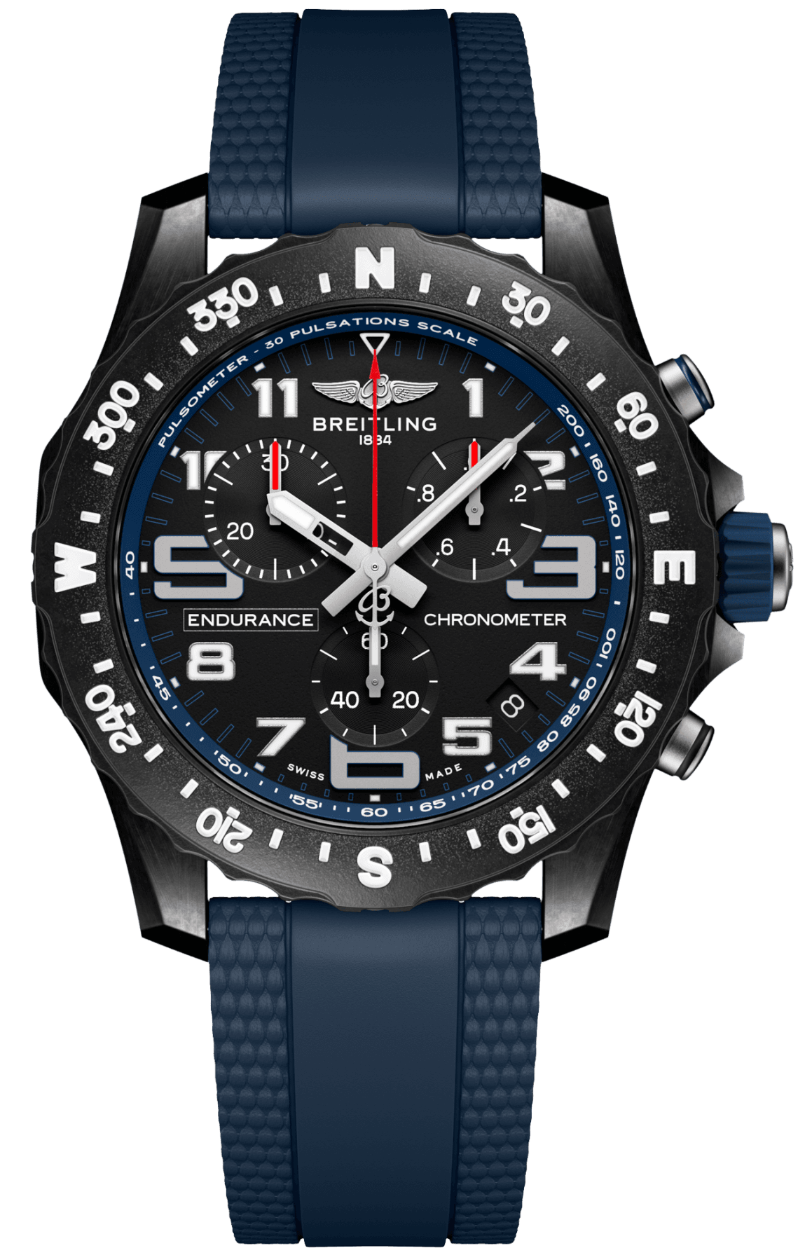 Breitling Watch Endurance Pro 44 X82310D51B1S2. Designed to be both a lightweight timepiece for athletes and a casual, everyday sports chronograph, the Endurance Pro perfectly blends innovative technology with a vibrant design to produce the ultimate athleisure watch. Designed for men and women whose active lives combine a professional mindset with a sporty lifestyle, the Endurance Pro is up to the challenges of a rigorous workout, but fashionable enough for everyday wear. The Endurance Pro features an ultralight Breitlight case, a robust material 3.3 times lighter than titanium and 5.8 times lighter than stainless steel. Nonmagnetic, thermally stable and hypoallergenic, Breitlight is highly resistant to scratches, traction and corrosion. It also has a feel that is warmer than metal and a slightly textured effect, accentuating the originality of the design. Exclusive to Breitling, the material is 100percent Swissmade. In 44 mm or 38 mm, the Endurance Pro is available to athletes with a multitude of colourful dials and rubber straps all fitting a Breitlight tang type buckle. The two sizes are respectively powered by Breitlings Caliber 82 and 83, both COSC certified SuperQuartz chronographs delivering exceptional precision.