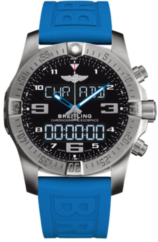 The watch features a 46mm titanium case achieved by a highly resistant carbon based treatment, a volcanic black dial housed beneath sapphire crystal glass with antireflective treatment and a Twin Pro blue rubber strap with a pushbutton folding clasp for easy wear. For ultimate functionality the Breitling B55 Exospace boasts a digital display, countdown timer, seven daily alarms, UTC worldtime, perpetual digital calendar and 100 metre water resistance.