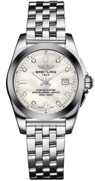 Designed for women in need of both style and performance, this Breitling Galactic 29 SleekT watch combines an array of dazzling brilliant cut diamonds with one of Breitling’s famous SuperQuartz movements. It’s polished stainless steel case measures to a dainty 29mm in size and is fitted with a smooth fixed bezel which pairs beautifully with the glistening finish of the white mother of pearl dial.