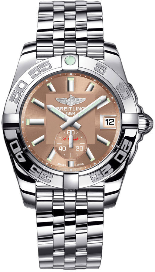 The centrepiece to this unisex Breitling watch is its stunning bronze coloured dial home to sleek steel indices, Superluminova coated hour and minute hands, a large date display at 3 o clock and a seconds sub dial at 6 o clock. The polished stainless steel case of this Breitling Galactic watch measures to 36mm in diameter and 12.3mm in depth giving it a bold but elegant feel that moulds effortlessly to the wrist. For one final touch of luxury, a matching stainless steel bracelet is added alongside a classic folding style clasp.