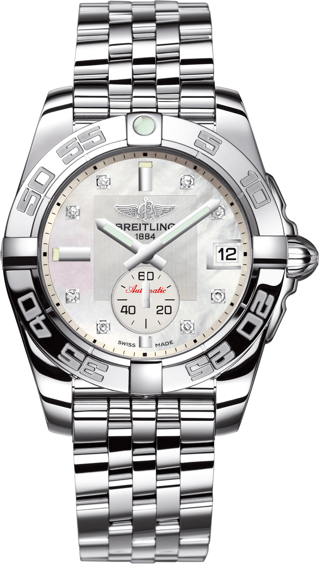 Designed for women in need of both style and performance, this Breitling Galactic 36 watch combines an array of dazzling brilliant cut diamonds with one of Breitling’s famous automatic movements. It’s exquisitely polished stainless steel case measures to a feminine 36mm in size and is fitted with a polished 60 minute scale bezel which pairs beautifully with the glowing finish of the white mother of pearl dial.