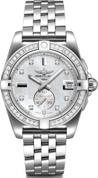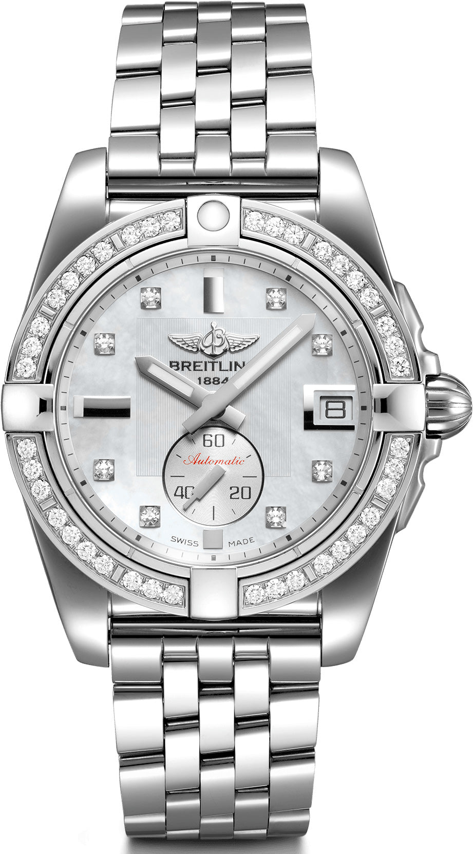 Designed for women in need of both style and performance, this Breitling Galactic 36 watch combines an array of dazzling brilliant cut diamonds with one of Breitling’s famous automatic movements. It’s exquisitely polished stainless steel case measures to a feminine 36mm in size and is fitted with an outstanding unidirectional diamond decorated bezel which pairs beautifully with the glowing finish of the white mother of pearl dial.