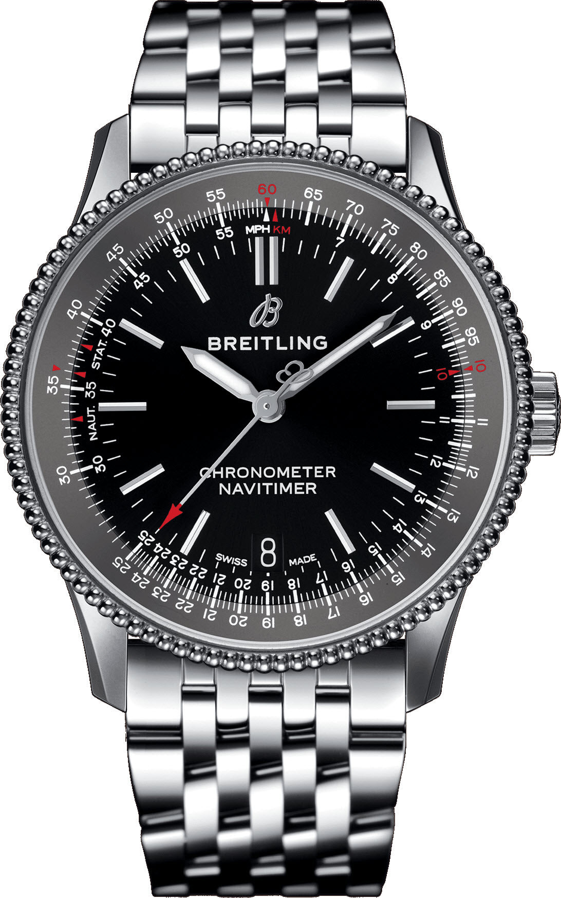 Part of one of Breitling’s most iconic and popular luxury watch collections, this striking Breitling Navitimer 1 Automatic watch boasts an elegant aviation inspired design in the shape of a 38mm stainless steel case, bidirectional beaded bezel with the brand’s famous slide rule function and a sophisticated stainless steel bracelet. The Navitimer watch collection has been a fan favourite with aeronautical enthusiasts since its original release in 1952 and this Breitling Navitimer 1 watch has been designed especially for pilots who require effortless legibility during their flights.