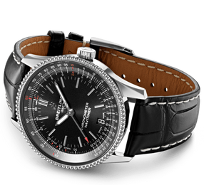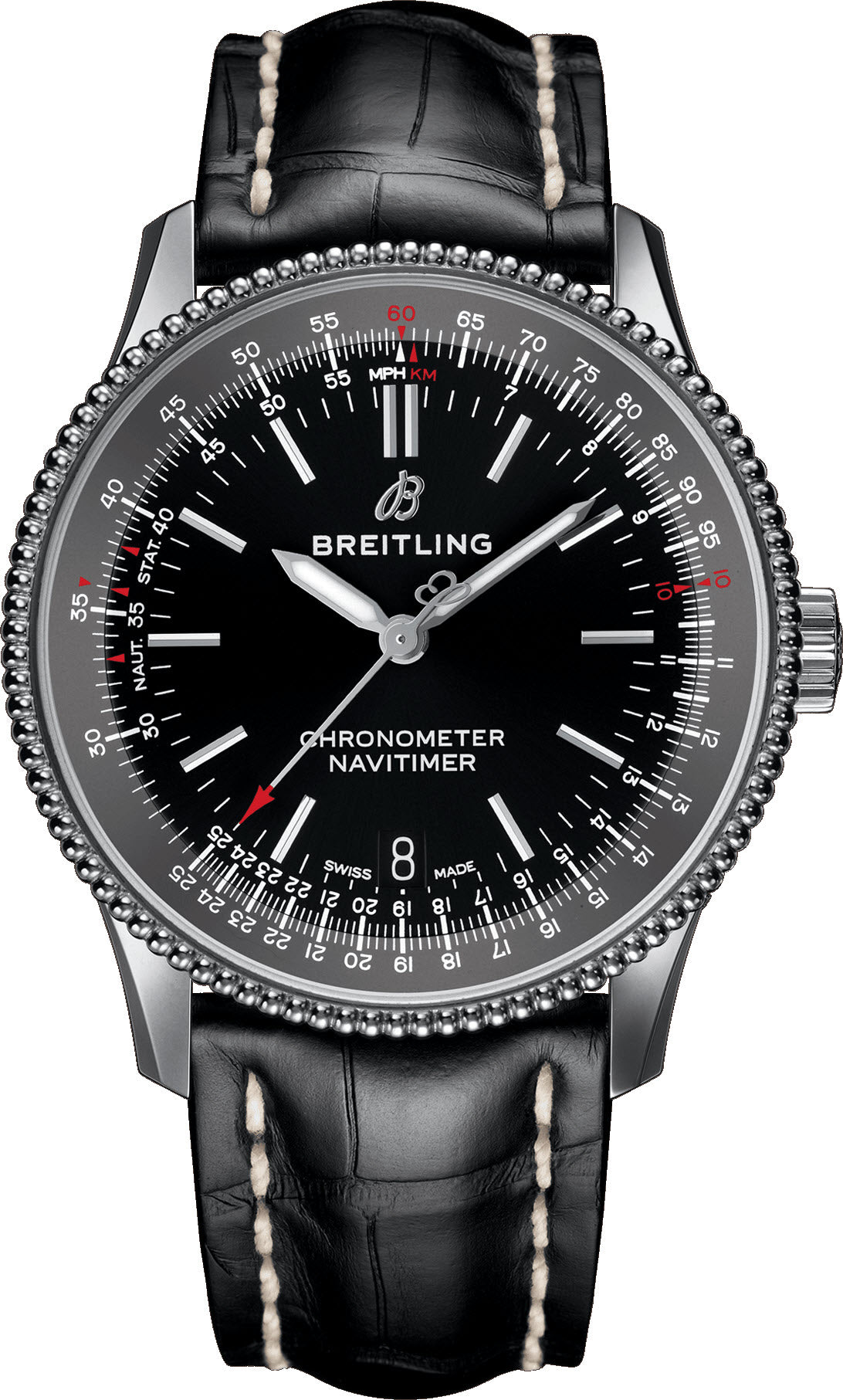 Part of one of Breitling’s most iconic and popular luxury watch collections, this striking Breitling Navitimer 1 Automatic watch boasts an elegant aviation inspired design in the shape of a 38mm stainless steel case, bidirectional beaded bezel with the brand’s famous slide rule function and a sophisticated black crocodile leather strap. The Navitimer watch collection has been a fan favourite with aeronautical enthusiasts since its original release in 1952 and this Breitling Navitimer 1 watch has been designed especially for pilots who require effortless legibility during their flights.