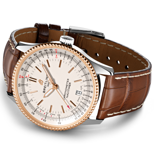 Part of one of Breitling’s most iconic and popular luxury watch collections, this striking Breitling Navitimer 1 Automatic watch boasts an elegant aviation inspired design in the shape of a 38mm stainless steel case, 18 carat rose gold bidirectional beaded bezel with the brand’s famous slide rule function and a sophisticated brown crocodile leather strap. The Navitimer watch collection has been a fan favourite with aeronautical enthusiasts since its original release in 1952 and this Breitling Navitimer 1 watch has been designed especially for pilots who require effortless legibility during their flights.