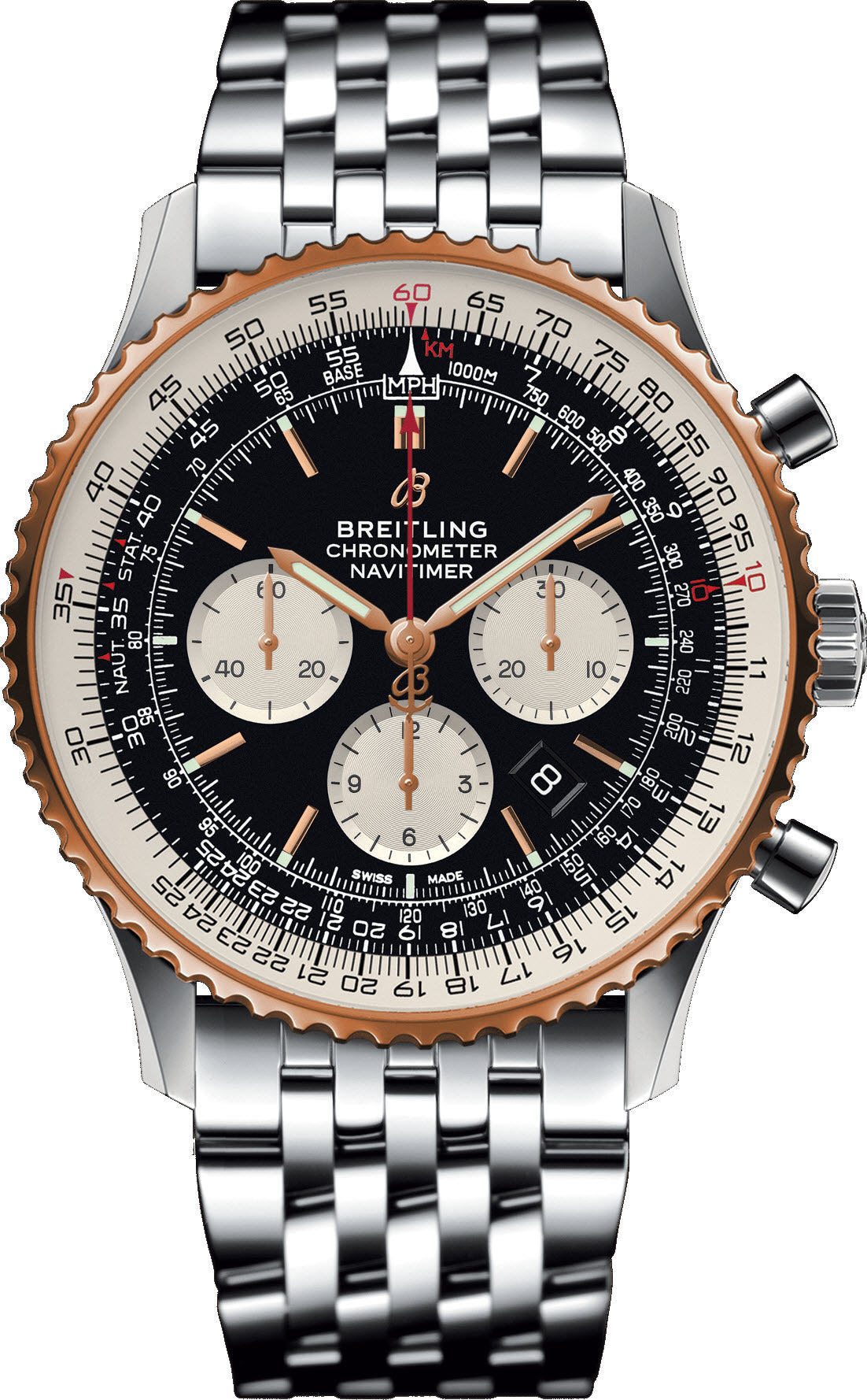 Part of one of Breitling’s most iconic and popular luxury watch collections, this striking Navitimer B01 Chronograph watch boasts an elegant aviation inspired design in the shape of a 46mm stainless steel case, 18 carat rose gold bidirectional rotating ratcheted bezel and sophisticated stainless steel bracelet. The Navitimer watch collection has been a fan favourite with aeronautical enthusiasts since its original release in 1952 and this Breitling Navitimer 01 watch has been designed especially for pilots who require easy to use chronograph function to time their flights.