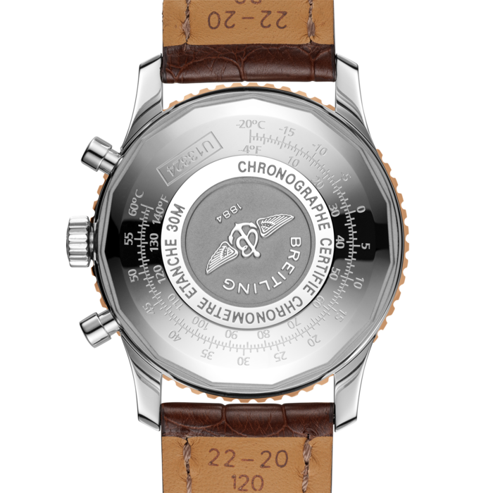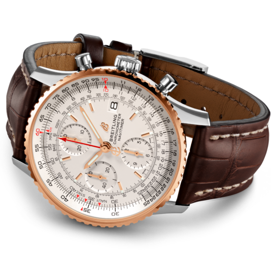 Full of innovation, this gorgeous Breitling Navitimer 1 Chronograph watch is equipped with the Breitling 13 COSC certified movement which provides an accuracy of -4 to +6 seconds a day and an impressive power reserve of 48 hours. The self-winding calibre can also be seen through the stunning sapphire crystal glass back where you can see the intricate components working together to power the functions laid on the crisp silver dial. The dial is also beautifully detailed rose gold hands and subtle red accents, a date window at 3 o clock and matching silver chronograph counters for 30 minutes and 12 hours. For one final touch of security and to assist in its water resistance of 30 metres, this Breitling Navitimer 1 Chronograph is fitted with cambered sapphire crystal glass treated with an antireflective coating on both sides.