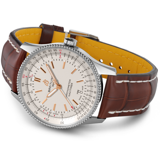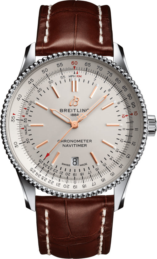 Part of one of Breitling’s most iconic and popular luxury watch collections, this striking Breitling Navitimer 1 Automatic watch boasts an elegant aviation inspired design in the shape of a 41mm stainless steel case, bidirectional beaded bezel with the brand’s famous slide rule function and a sophisticated brown crocodile leather strap. The Navitimer watch collection has been a fan favourite with aeronautical enthusiasts since its original release in 1952 and this Breitling Navitimer 1 watch has been designed especially for pilots who require effortless legibility during their flights.