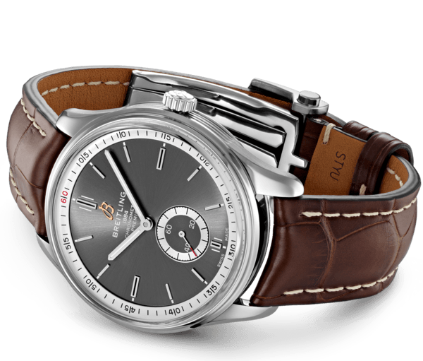 The striking anthacite dial of this Breitling Premier Automatic 40 watch is its centrepiece decorated with sleek steel hands and indices, a rose gold Breitling logo and a sophisticated seconds track encircling the edge. Hidden within the heart of this Breitling watch is the chronometer certified Breitling 37 self-winding mechanical movement which equips the timepiece with hour and minute hands, a seconds subsidiary dial at 6 o clock and an impressive power reserve of 38 hours. The stainless steel case measures to a neat 40mm in size and comes fitted with a classic push-in crown, cambered scratch resistant sapphire crystal glass and a stylish brown crocodile leather strap paired with a matching steel pin buckle.