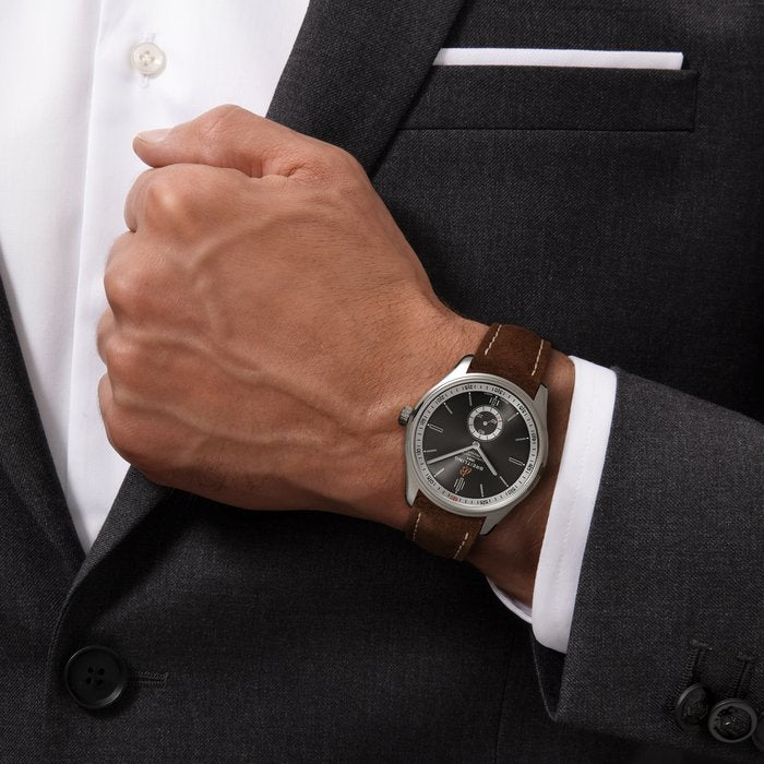 The striking anthacite dial of this Breitling Premier Automatic 40 watch is its centrepiece decorated with sleek steel hands and indices, a rose gold Breitling logo and a sophisticated seconds track encircling the edge. Hidden within the heart of this Breitling watch is the chronometer certified Breitling 37 self-winding mechanical movement which equips the timepiece with hour and minute hands, a seconds subsidiary dial at 6 o clock and an impressive power reserve of 38 hours. The stainless steel case measures to a neat 40mm in size and comes fitted with a classic push-in crown, cambered scratch resistant sapphire crystal glass and a stylish brown nubuck leather strap paired with a matching steel pin buckle.