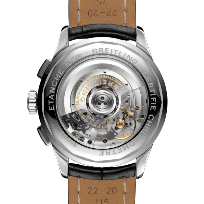 The greatest attribute of this Breitling Premier B01 Chronograph watch is the Breitling Manufacture Calibre 01, a chronometer certified self-winding movement that is considered one of the finest calibres in the world. You can witness the exquisite components hard at work through the transparent case back as it powers the hour and minutes hands, chronograph central seconds, seconds counter, chronograph minute counter and date window at 6 o clock. The striking anthracite dial is detailed with beautifully contrasting black chronograph counters, a black inner bezel and subtle red accents on the tachymeter scale and central chronograph hand. Equipped with a 100 metre water resistance and a 70 hour power reserve, this magnificent Breitling B01 Chronograph is given one final touch of elegance with the addition of a black calfskin leather strap and stainless steel buckle.