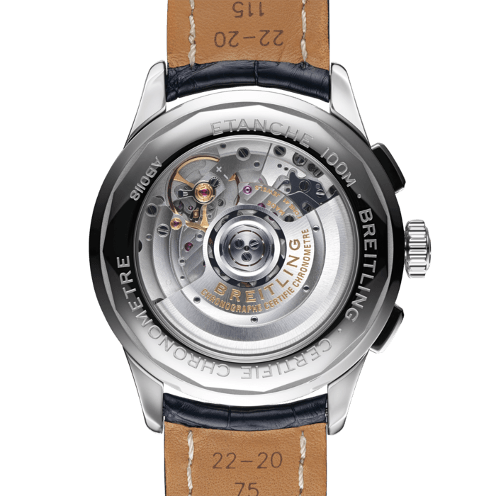 The greatest attribute of this Breitling Premier B01 Chronograph watch is the Breitling Manufacture Calibre 01, a chronometer certified self-winding movement that is considered one of the finest calibres in the world. You can witness the exquisite components hard at work through the transparent case back as it powers the hour and minutes hands, chronograph central seconds, continuous seconds counter, chronograph minute counter and date window at 6 o clock. The striking blue dial is detailed with contrasting black chronograph counters, silvered hands and indices to match the 42mm stainless steel case and subtle red accents on the tachymeter scale and central chronograph hand. Equipped with a 100 metre water resistance and a 70 hour power reserve, this magnificent Breitling B01 Chronograph is given one final touch of elegance with the addition of a blue crocodile leather strap and stainless steel folding clasp.