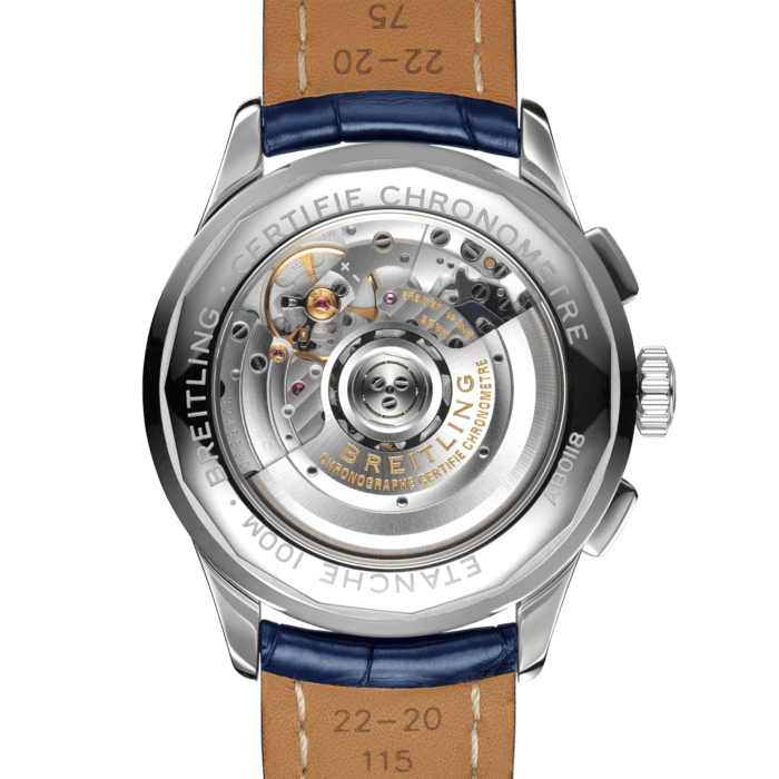 The greatest attribute of this Breitling Premier B01 Chronograph watch is the Breitling Manufacture Calibre 01, a chronometer certified self-winding movement that is considered one of the finest calibres in the world. You can witness the exquisite components hard at work through the transparent case back as it powers the hour and minutes hands, chronograph central seconds, seconds counter, chronograph minute counter and date window at 6 o clock. The striking blue dial is detailed with beautifully contrasting black chronograph counters, a black inner bezel and subtle red accents. Equipped with a 100 metre water resistance and a 70 hour power reserve, this magnificent Breitling B01 Chronograph is given one final touch of sophistication with an elegant blue crocodile leather strap and stainless steel pin buckle.