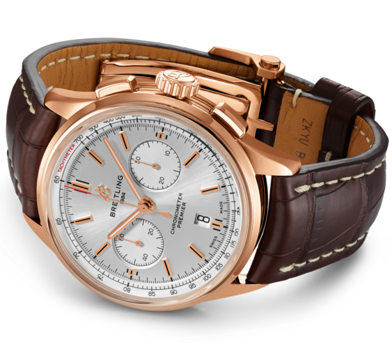 The greatest attribute of this Breitling Premier B01 Chronograph watch is the Breitling Manufacture Calibre 01, a chronometer certified self-winding movement that is considered one of the finest calibres in the world. You can witness the exquisite components hard at work through the transparent case back as it powers the hour and minutes hands, chronograph central seconds, continuous seconds counter, chronograph minute counter and date window at 6 o clock. The striking silver dial is detailed with matching silver chronograph counters, rose gold hands and indices to match the 18 carat rose gold case and subtle red accents on the tachymeter scale and central chronograph hand. Equipped with a 100 metre water resistance and a 70 hour power reserve, this magnificent Breitling B01 Chronograph is given one final touch of elegance with the addition of a brown crocodile leather strap and 18 carat rose gold buckle.