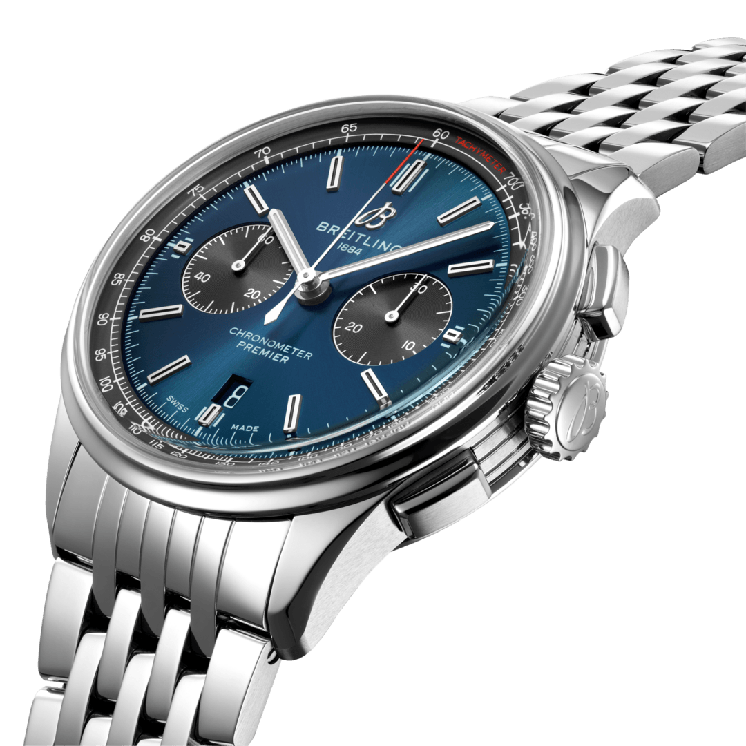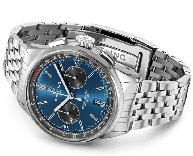 The greatest attribute of this Breitling Premier B01 Chronograph watch is the Breitling Manufacture Calibre 01, a chronometer certified self-winding movement that is considered one of the finest calibres in the world. You can witness the exquisite components hard at work through the transparent case back as it powers the hour and minutes hands, chronograph central seconds, seconds counter, chronograph minute counter and date window at 6 o clock. The striking blue dial is detailed with beautifully contrasting black chronograph counters, a black inner bezel and subtle red accents. Equipped with a 100 metre water resistance and a 70 hour power reserve, this magnificent Breitling B01 Chronograph is given one final touch of sophistication with an elegant stainless steel bracelet and folding buckle.