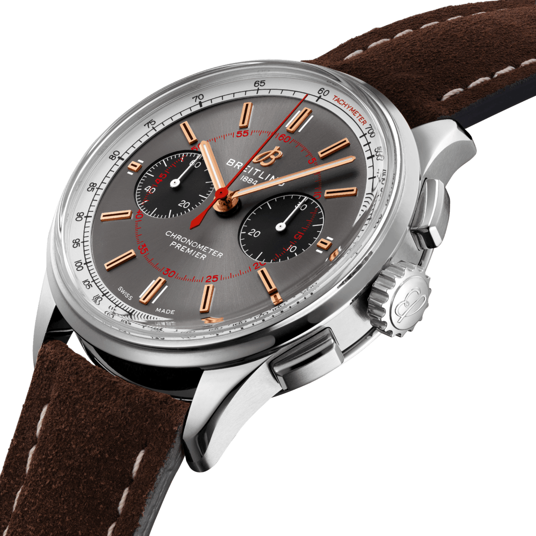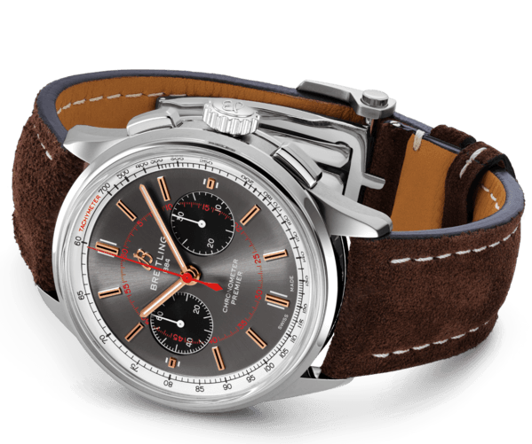 Just like the thousands of visitors that visit the Wheels and Waves festival, this Breitling Premier B01 Limited Edition is driven by action, purpose and style. It comes beautifully presented in a sleek 42mm stainless steel case with a smooth fixed bezel, sapphire crystal glass and an engraved plate with a special Breitling inscription on the left hand side. The dial of this Breitling Wheels and Waves watch sets it apart from other timepieces in the Breitling Premier watch collection thanks to its golden hour markers, Superluminova coated hour and minute hands, red painted central seconds hand and contrasting black chronograph counters for smalls seconds and 60 minutes. Each of these functions are powered by the brand’s flagship movement, the Breitling Manufacture 01 calibre which has been COSC certified with an accuracy of +4 to -6 seconds a day. The automatic movement, with its power reserve of 70 hours, can also be seen through the exhibition sapphire crystal case back alongside an inscription proving its limited edition status.