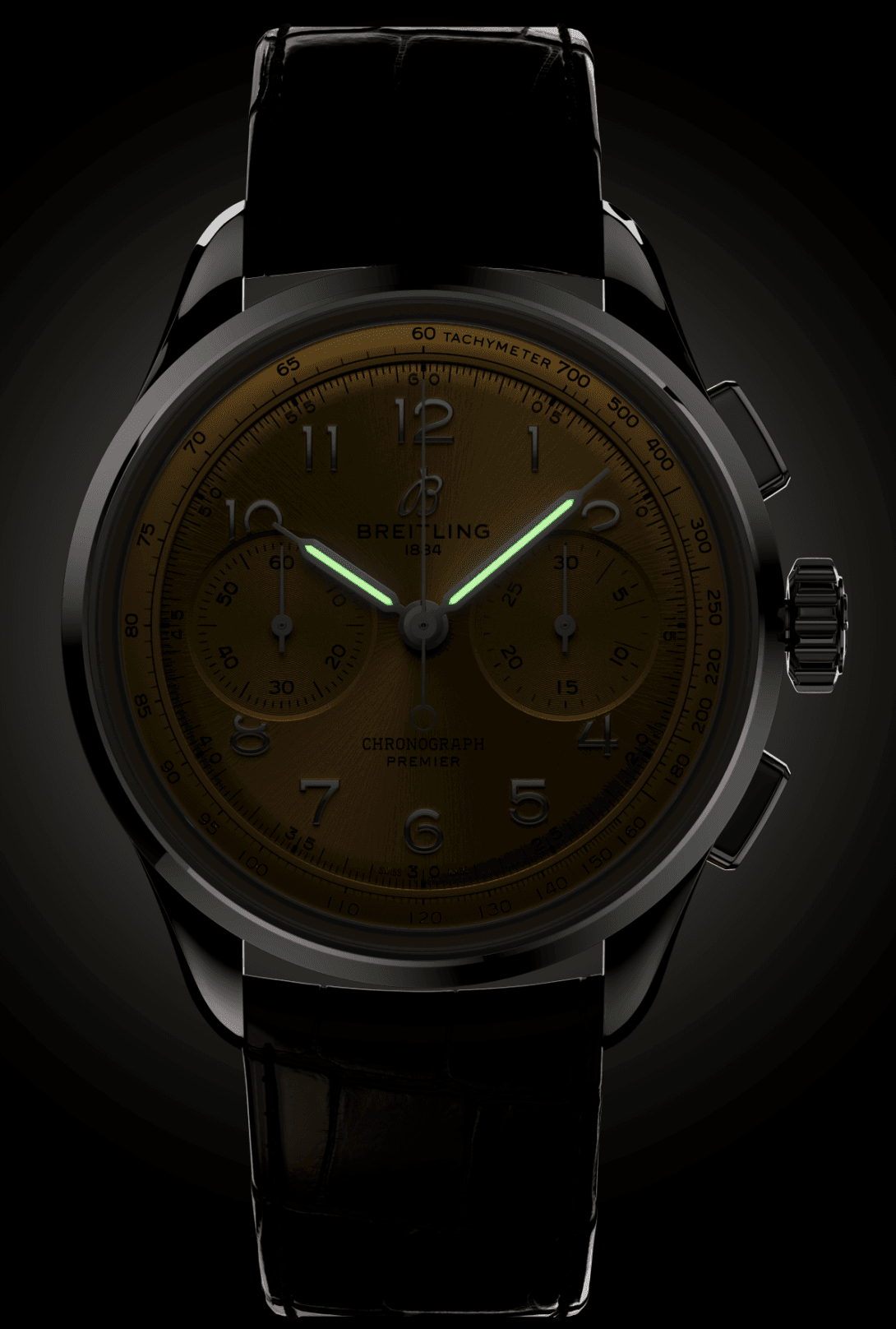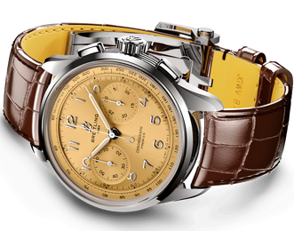 Breitling Watch Premier B09 Chronograph AB0930F51H1P1. The Premier collection embodies Breitling’s legacy as the inventor of the modern chronograph. As Willy Breitling put it, the Premier is the “unmistakable stamp of impeccable taste. The modern Premier collection brings this history back to life while showcasing Breitling’s highest level of watchmaking. It comes a range of complications: the Chronograph, the Duograph split-second, the Datora full calendar and the Tourbillon. The Premier Chronograph’s heritage-revived design features a variety of elegant design details, such as grooves on the case sides, rectangular pushers, applied Arabic numerals and vintage-inspired hands. It also features an open sapphire caseback that beautifully displays the manually wound COSC-certified Breitling Manufacture Caliber B09.