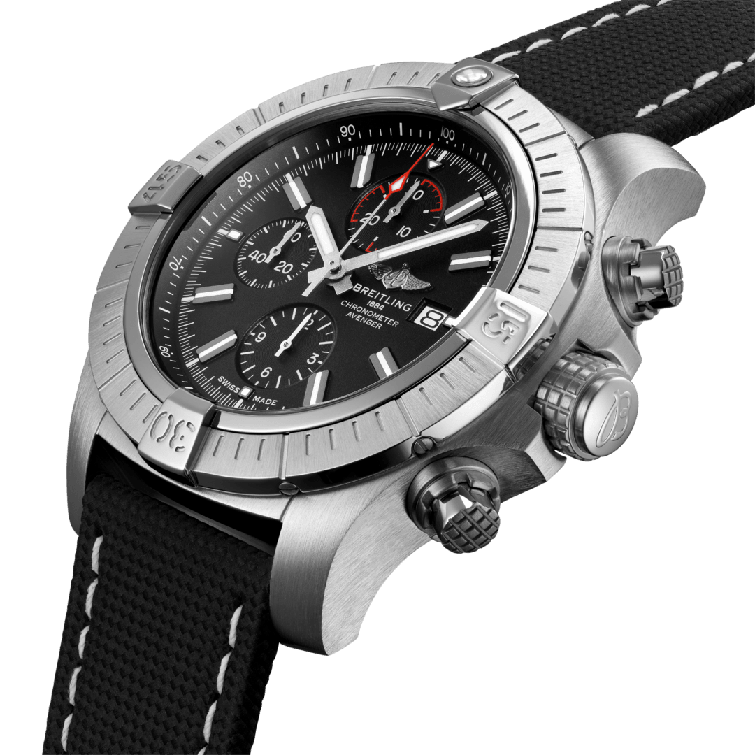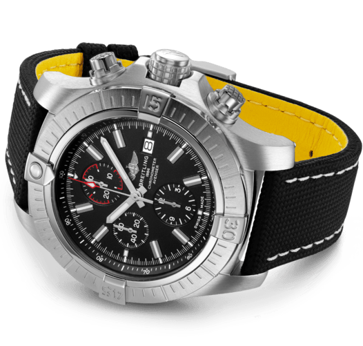 A purpose built pilots watch for the true airborne adventurer, this Breitling Super Avenger Chronograph 48 promises to be extremely robust, shock resistant and effortless to use while controlling the skies. It’s statement 48mm stainless steel case brings a strong presence to the wrist thanks to its large 60 minute scale unidirectional bezel with ratcheted detailing and screw down crown and chronograph pushers decorated with a special grip pattern to ensure easy operation when wearing thick gloves in the cockpit.