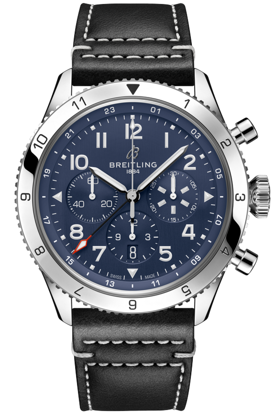 The Breitling Super AVI Vought F4U Corsair watch continues to impress with a 46mm stainless steel case equipped with a bi-directional ratcheted bezel offering up a 12 hour scale to pair with the GMT hand and inner 24 hour scale at the centre. The case also boasts sapphire crystal glass with anti-reflective treatment, a screw in crown, a 100 metre water resistant rating and an exhibition case back decorated with an image of its namesake aircraft. Through the back you can witness the Breitling Manufacture Caliber B04 automatic winding movement with column wheel and vertical clutch mechanism, 4Hz frequency, 70 hour power reserve, and like all Breitling watches, COSC certification. To complete the Breitling Super AVI B04 Chronograph GMT 46 Vought F4U Corsair watch, a black calfskin leather strap is added alongside a classic steel folding buckle.