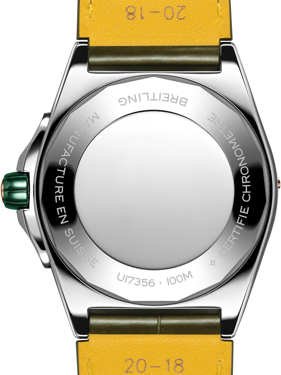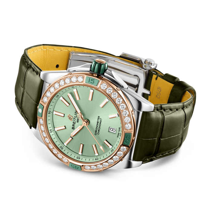 Breitling Watch Super Chronomat Automatic 38 Mint Green Alligator U17356531L1P1. The first in the "Super" category of Chronomat with a diamond bezel, the Super Chronomat Automatic 38 is designed to make a statement, whether paired with a power suit or a t-shirt and jeans. You can tell a Super from the rest of the Chronomat family by the ceramic rider tabs and crown, and the rubber rouleaux bracelet only available with this supercharged line. Aside from its enhanced presence, the Automatic 38 also has a radiant side. Oversized lab-crown diamonds make the rounds of its 18k red gold or stainless-steel bezel. Its dial colours add just the right amount of eve candy. Pair a favourite shade with a choice of bracelet or strap.