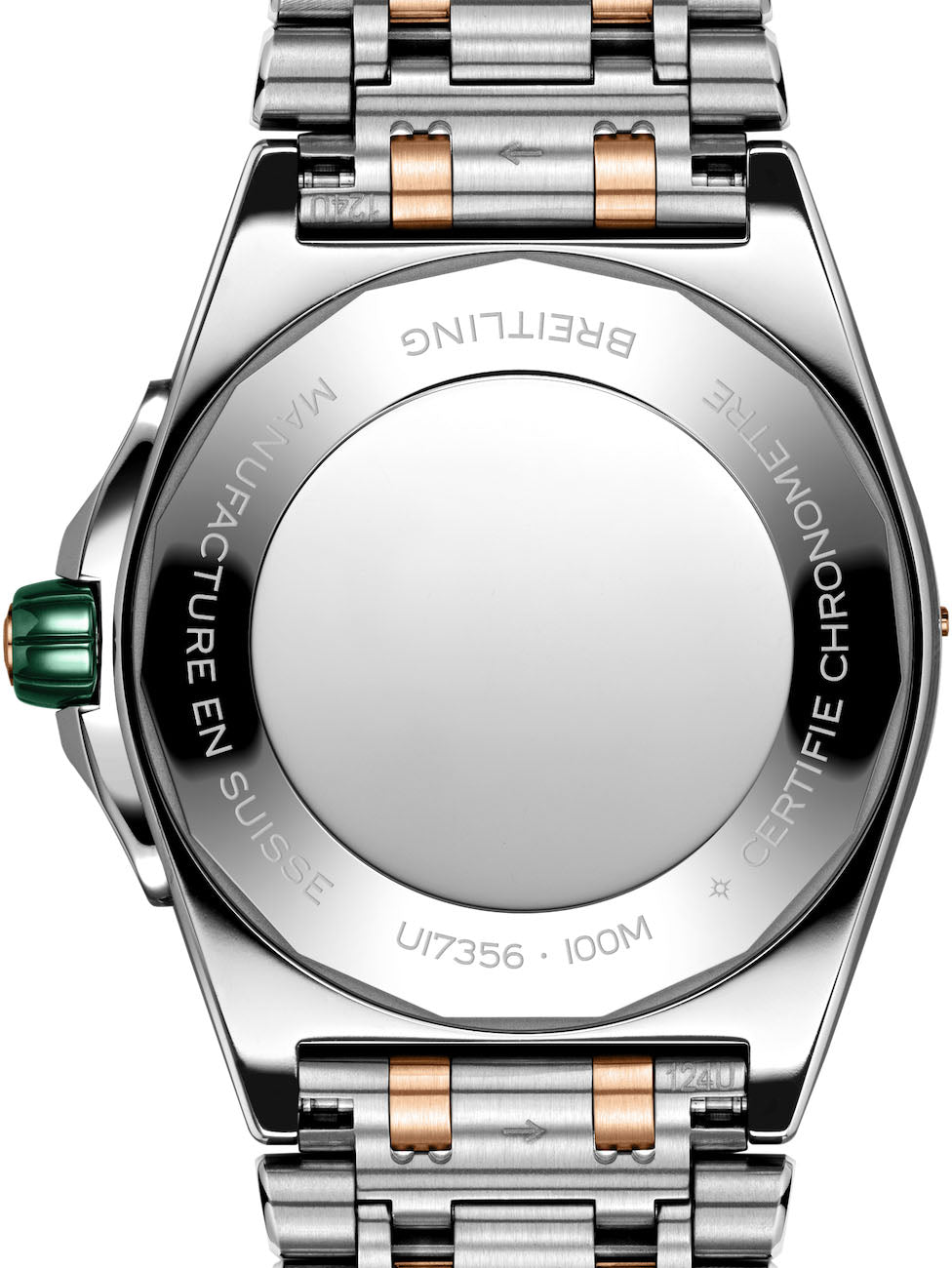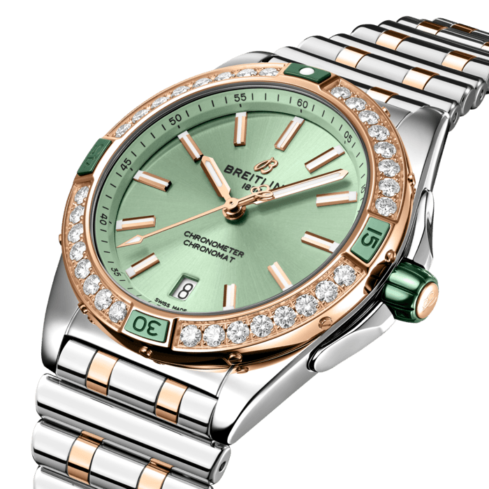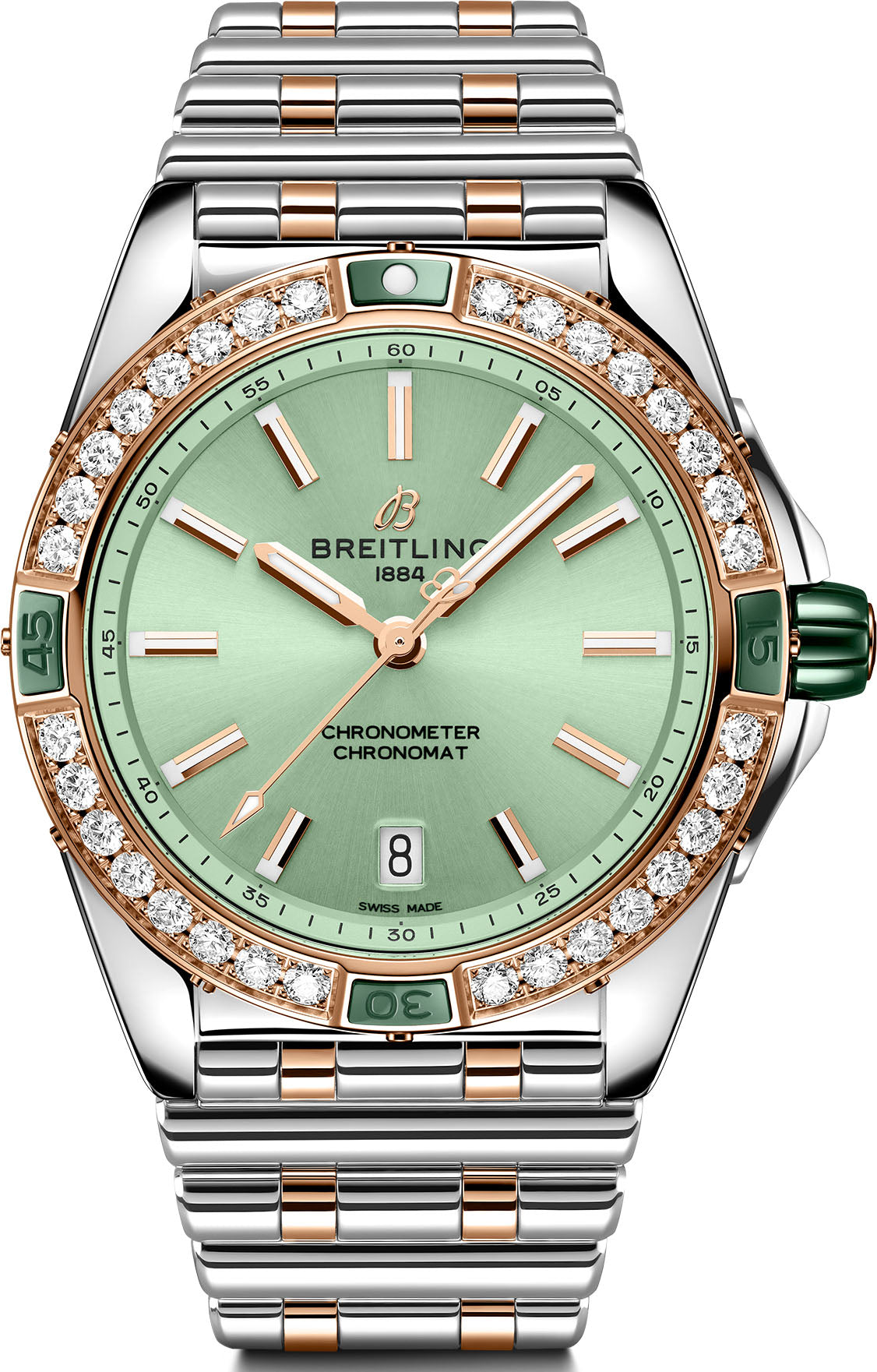 Breitling Watch Super Chronomat Automatic 38 Mint Green Bracelet U17356531L1U1. The first in the "Super" category of Chronomat with a diamond bezel, the Super Chronomat Automatic 38 is designed to make a statement, whether paired with a power suit or a t-shirt and jeans. You can tell a Super from the rest of the Chronomat family by the ceramic rider tabs and crown, and the rubber rouleaux bracelet only available with this supercharged line. Aside from its enhanced presence, the Automatic 38 also has a radiant side. Oversized lab-arown diamonds make the rounds of its 18k red gold or stainless-steel bezel. Its dial colors add iust the right amount of eve candv. Pair a favourite shade with a choice of bracelet or strap.