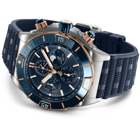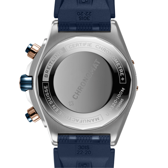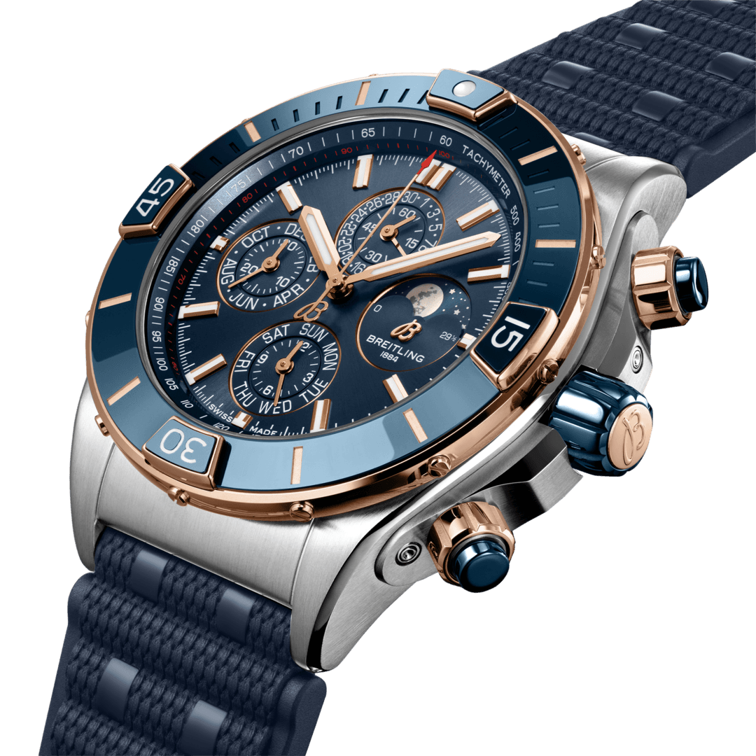Alongside classic chronograph complication including a 12 hour totaliser and a 30 minutes counter and a power reserve of 42 hours, the Breitling Chronomat B01 Chronograph Four Year Calendar watch provides day, date, month, and moon phase indicators. The moonphase complication is a beautiful tribute to the night sky at 3 o’clock with a silver moon and starry backdrop. The 44 millimetre stainless steel case of this men’s Breitling watch comes equipped with a rubber strap inspired by the iconic Chronomat Rouleaux bracelet and a matching blue ceramic insert bezel with interchangeable rider tabs and a 60 minute scale. The stainless steel case also features cambered sapphire crystal glass with anti-reflective treatment on both sides, a screw locked crown with two gaskets and a screwed case back water resistant to 100 metres. To match the case and bezel, the dial is dressed in royal blue and adorned with rose gold accents and matching blue subsidiary dials.