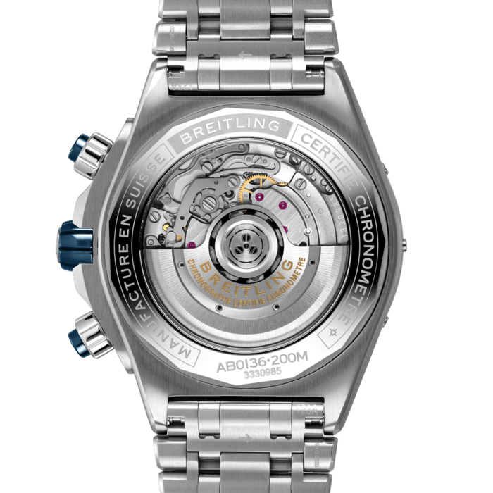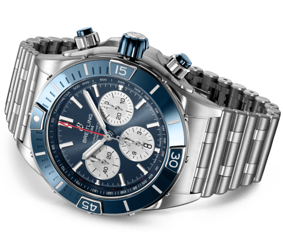 Housed within the men’s Breitling Super Chronomat B01 Chronograph watch is the Breitling Manufacture Calibre 01 automatic winding movement. Created entirely in-house by the luxury watch brand, the movement comes equipped with a column wheel and vertical clutch mechanism for the chronograph which on the smooth blue dial delivers a bright red central chronograph seconds hand and two subsidiary counters for 30 minutes and 12 hours. Also situated on the dial is a subsidiary counter dressed in silver for small seconds and two large central hands for hours and minutes. For exceptional readability in all lighting conditions, the hour and minute hands are treated with Superluminova coating as is the rounded marker at 12 o’clock. The Super Chronomat B01 Chronograph 44 watch is completed by a power reserve of 70 hours, a screw locked crown with two gaskets and a water resistant rating of 200 metres.