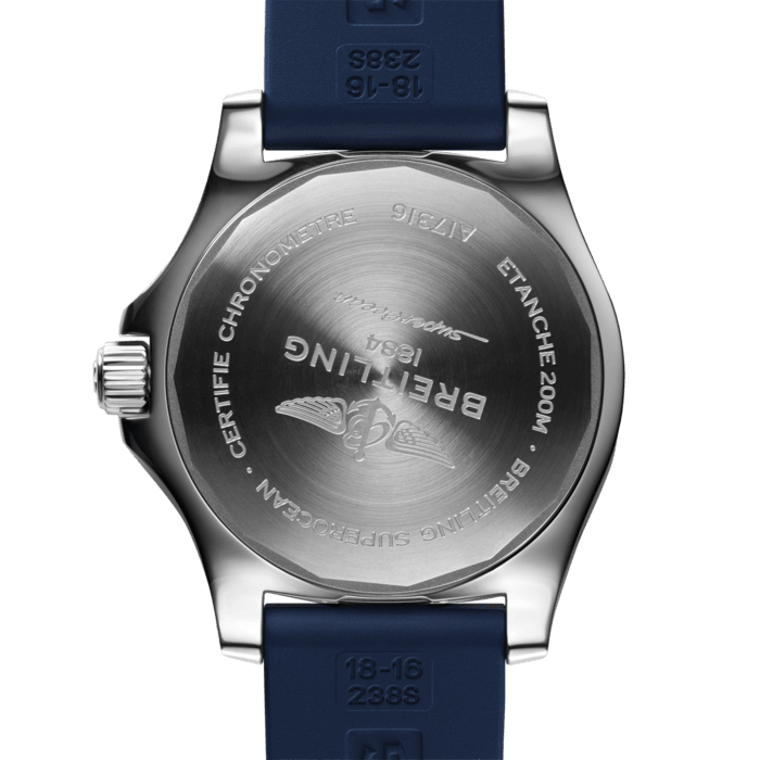Hidden within the heart of this Breitling ladies Superocean watch is the remarkable Breitling 17 self-winding mechanical calibre. This impressive movement is COSC certified to be accurate to -4 to +6 seconds a day and equips the Breitling diving watch with large Superluminova coated hour and minute hands, a large red-tipped arrow shaped seconds hand, a date window at 3 o clock and a power reserve of 38 hours. The combination of the luminous dial elements and anti-reflective sapphire crystal glass makes it the women’s Breitling watch of choice for endurance, elegance and easy legibility.