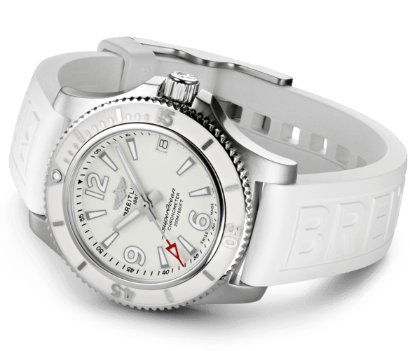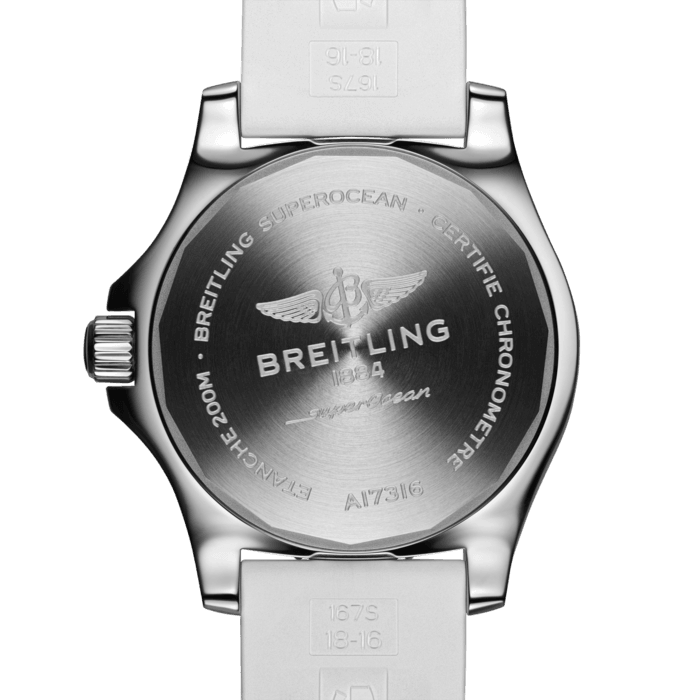 Hidden within the heart of this Breitling ladies Superocean watch is the remarkable Breitling 17 self-winding mechanical calibre. This impressive movement is COSC certified to be accurate to -4 to +6 seconds a day and equips the Breitling diving watch with large Superluminova coated hour and minute hands, a large red-tipped arrow shaped seconds hand, a date window at 3 o clock and a power reserve of 38 hours. The combination of the luminous dial elements and anti-reflective sapphire crystal glass makes it the women’s Breitling watch of choice for endurance, elegance and easy legibility.