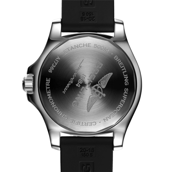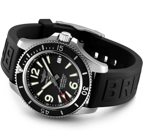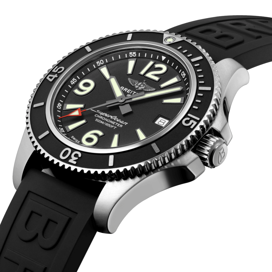 Hidden within the heart of this Breitling Superocean watch is the remarkable Breitling 17 self-winding mechanical calibre. This impressive movement is chronometer certified to be accurate to -4 to +6 seconds a day and equips the Breitling diving watch with large Superluminova coated hour and minute hands, a large red-tipped arrow shaped seconds hand, a date window at 3 o clock and a power reserve of 38 hours. The combination of the luminous dial elements and anti-reflective sapphire crystal glass makes it the men’s Breitling watch of choice for endurance, elegance and easy legibility.